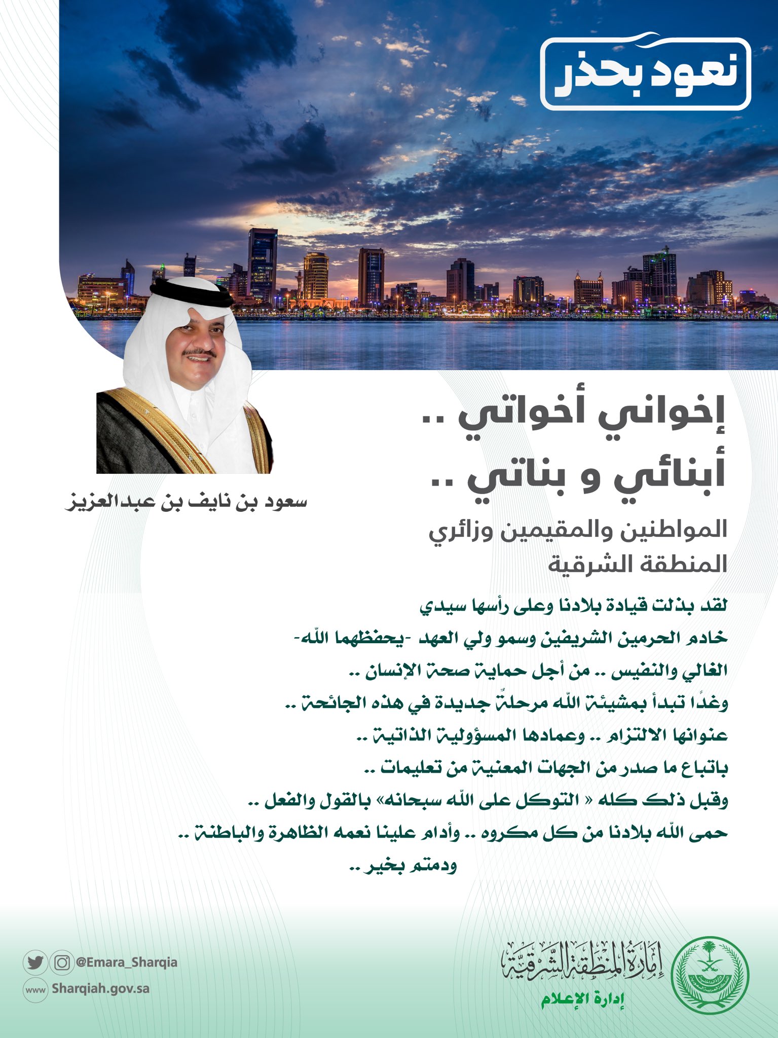 بدوره وجه، نائب أمير المنطقة الشرقية، الأمير أحمد بن فهد بن سلمان بن عبدالعزيز، رسالة لأهالي المنطقة بمناسبة رفع التجول قال فيها: "نحن على موعد جديد.. مرحلة نراهن فيها على الوعي الذاتي، والحرص على اتباع التعليمات والإرشادات.. مستشعرين ما بذلته الحكومة الرشيدة بقيادة سيدي خادم الحرمين الشريفين، وسمو ولي عهده- يحفظهما الله". وأضاف سموه: "إننا بعد التوكل على الله، والأخذ بالأسباب مؤمنين أن هذه المرحلة ستمضي بمشيئة الله، متى ما اتبعنا التعليمات، واستشعرنا أهمية الالتزام بالبروتوكولات الوقائية.. حمى الله بلادنا من كل مكروه". وكانت الداخلية أعلنت أمس رفع منع التجول اعتبارا من صباح اليوم فيما صرح مصدر مسؤول في الوزارة ، بأنه إلحاقا للإجراءات الاحترازية والتدابير "البروتوكولات" الوقائية للقطاعات المعلنة بتاريخ السادس والعاشر من شهر شوال 1441ه، تعلن وزارة الداخلية عن الإجراءات الاحترازية والتدابير " البروتوكولات" الوقائية للقطاعات للحد من انتشار فيروس كورونا الجديد، التي تقتضيها متطلبات عودة الأوضاع العامة لطبيعتها. ---------------------------------------------------------------------------------------------------------------------------------------------------------------------------------------------------------------------------------------------------------------------------------------------------------------------------------------------------------------------------------------------------------------------------------------------------------------------------------------------------------------------------------------------------------------------------------------------------------------------------------------------------------------------------------------------------------------------------------------------------------------------------------------------------------------------------------------------------------------------------------------------------------------------------------------------------------------------------------------------------------------------------------------------------------------------------------------------------------------------------------------------------------------------------------------------------------------------------------------------------------------------------------------------------------------------------------------------------------------------------------------------------------------------------------------------------------------------------------------------------------------------------------------------------------------------------------------------------------------------------------------------------------------------------------------------------------------------------------------------------------------------------------------------------------------------------------------------------------------------------------------------------------------------------------------------------------------------------------------------------------------------------------------------------------------------------------------------------------------------------------------------------------------------------------------------------------------------------------------------------------------------------------------------------------------------------------------------------------------------------------------------------------------------------------------------------------------------------------------------------------------------------------------------------------------------------------------------------------------------------------------------------------------------------------------------------------------------------------------------------------------------------------------------------------------------------------------------------------------------------------------------------------------------------------------------------------------------------------------------------------------------------------------------------------------------------------------------------------------------------------------------------------------------------------------------------------------------------------------------------------------------------------------------------------------------------------------------------------------------------------------------------------------------------------------------------------------------------------------------------------------------------------------------------------------------------------------------------------------------------------------------------------------------------------------------------------------------------------------------------------------------------------------------------------------------------------------------------------------------------------------------------------------------------------------------------------------------------------------------------------------------------------------------------------------------------------------------------------------------------------------------------------------------------------------------------------------------------------------------------------------------------------------------------------------------------------------------------------------------------------------------------------------------------------------------------------------------------------------------------