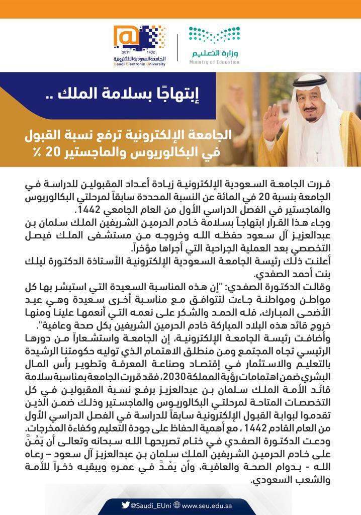 أعلنت رئيسة الجامعة الإلكترونية الأستاذة الدكتورة ليلك بنت أحمد الصفدي زيادة أعداد المقبولين للدراسة في الجامعة بنسبة 20% عن النسبة المحددة سابقاً لمرحلتي البكالوريوس والماجستير في الفصل الدراسي الأول من العام الجامعي 1442. وقالت الدكتورة ليلك الصفدي في تصريح لها إن هذا القرار جاء ابتهاجاً بسلامة خادم الحرمين الشريفين الملك سلمان بن عبدالعزيز آل سعود – حفظه الله – وخروجه بصحة وعافية يوم أمس من مستشفى الملك فيصل التخصصي بعد العملية الجراحية التي أجراها مؤخراً. وأضافت أن الجامعة الإلكترونية تستشعر كذلك دورها الرئيس تجاه المجتمع ومن منطلق الاهتمام الذي توليه حكومتنا الرشيدة بالتعليم والاستثمار في اقتصاد وصناعة المعرفة وتطوير رأس المال البشري ضمن اهتمامات رؤية المملكة 2030، وسيتم رفع نسبة المقبولين في كل التخصصات المتاحة لمرحلتي البكالوريوس والماجستير وذلك ضمن الذين تقدموا لبوابة القبول الإلكترونية سابقاً للدراسة في الفصل الدراسي الأول من العام القادم 1442، مع أهمية الحفاظ على جودة التعليم وكفاءة المخرجات. ودعت الدكتورة الصفدي في ختام تصريحها الله سبحانه وتعالى أن يَمُنَّ على خادم الحرمين الشريفين الملك سلمان بن عبدالعزيز آل سعود وسمو ولي عهده الأمين – حفظهما الله – بدوام الصحة والعافية، وأن يَمُدَّ في عمرهِما ويبقيهما ذخراً للأمة والشعب السعودي. 1. #وظائف شاغرة بشركة BAE SYSTEMS في 3 مدن 2. 8 أنواع من الطعام لا يجب وضعهم في الثلاجة أبدًا 3. توزيع حالات كورونا في السعودية.. مكة وخميس مشيط تتصدران 4. السعودية تسجل 1686 إصابة جديدة ب كورونا وتعافي 4460 ----------------------------------------------------------------------------------------------------------------------------------------------------------------------------------------------------------------------------------------------------------------------------------------------------------------------------------------------------------------------------------------------------------------------------------------------------------------------------------------------------------------------------------------------------------------------------------------------------------------------------------------------------------------------------------------------------------------------------------------------------------------------------------------------------------------------------------------------------------------------------------------------------------------------------------------------------------------------------------------------------------------------------------------------------------------------------------------------------------------------------------------------------------------------------------------------------------------------------------------------------------------------------------------------------------------------------------------------------------------------------------------------------------------------------------------------------------------------------------------------------------------------------------------------------------------------------------------------------------------------------------------------------------------------------------------------------------------------------------------------------------------------------------------------------------------------------------------------------------------------------------------------------------------------------------------------------------------------------------------------------------------------------------------------------------------------------------------------------------------------------------------------------------------------------------------------------------------------------------------------------------------------------------------------------------------------------------------------------------------------------------------------------------------------------------------------------------------------------------------------------------------------------------------------------------------------------------------------------------------------------------------------------------------------------------------------------------------------------------------------------------------------------------------------------------------------------------------------------------------------------------------------------------------------------------------------------------------------------------------------------------------------------------------------------------------------------------------------------------------------------------------------------------------------------------------------------------------------------------------------------------------------------------------------------------------------------------------------------------------------------------------------------------------------------------------------------------------------------------------------------------------------------------------------------------------------------------------------------------------------------------------------------------------------------