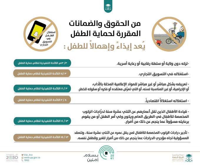 أكدت النيابة العامة أن الطفل يتمتع بحقوق وضمانات مقررة لصالحه شرعًا ونظامًا، ويُحظر المساس بها تحت أي ذريعة كانت. وتابعت النيابة أن الطفل يحظى بتوفير كافة وسائل الأمن والسلامة فيما يقدم له من ألعاب ترفيهية تتناسب مع سنه. وأوضحت أن من بين أوجه الإيذاء والإهمال التي تستوجب المساءلة استغلال الطفل في التسويق التجاري أو استغلاله اقتصاديًا. ومن بين أوجه الإيذاء تأجير الدراجات للطفل أقل من 12 عامًا.