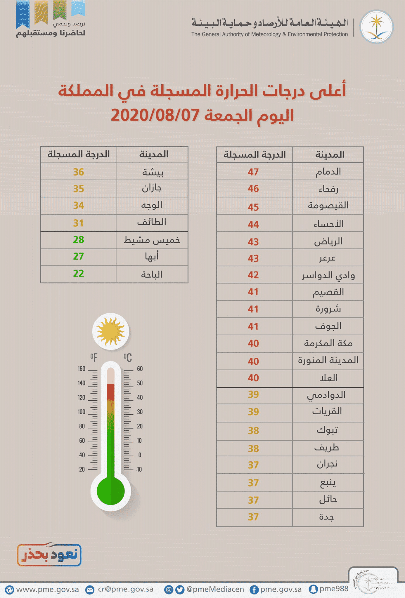 أعلنت الهيئة العامة للأرصاد وحماية البيئة عن أعلى درجة حرارة سجلتها المملكة اليوم الجمعة. وقالت الأرصاد: إن أعلى درجة حرارة اليوم سجلتها الدمام ب47 درجة مئوية وبعدها رفحاء ب46 درجة ثم القيصومة ب45 درجة وبعدها الأحساء 44 درجة والرياض ب43 درجة. أما أقل درجات الحرارة التي سجلتها المملكة اليوم فكانت من نصيب الباحة ب22 درجة وأبها 27 درجة ثم خميس مشيط ب28 درجة. ويمكن الاطلاع على درجات الحرارة المسجلة في المملكة اليوم فيما يلي: الطقس غدًا: وفي السياق ذاته، توقعت الأرصاد وحماية البيئة استمرار هطول الأمطار الرعدية من متوسطة إلى غزيرة مصحوبة برياح نشطة مثيرة للأتربة والغبار غدًا السبت على مناطق نجران، جازان، عسير، الباحة، تمتد إلى مرتفعات منطقة مكةالمكرمة تشمل السواحل من تلك المناطق، كما تنشط الرياح السطحية المثيرة للأتربة والغبار على أجزاء من مناطق الرياضوالشرقية، تمتد إلى نجران والأجزاء الشرقية من المرتفعات الجنوبية الغربية والغربية. ولفتت إلى أن الرياح السطحية في البحر الأحمر ستكون جنوبية غربية إلى شمالية غربية بسرعة 15- 42 كم/ ساعة، وفي بحر العرب ستكون غربية إلى شمالية غربية بسرعة 14- 38 كم/ ساعة. 1. النيابة توجه بالقبض على أشخاص نشروا الكراهية والتعصب في الوسط الرياضي 2. السعودية تسجل 1567 حالة كورونا جديدة وتعافي 1859 3. المنطقة الشرقية تتصدر إصابات كورونا الجديدة ب 281 وإجمالي الوفيات بالمملكة 3093 4. وفاة مساعد وزير الدفاع محمد بن عبدالله العايش إثر مرض عانى منه -----------------------------------------------------------------------------------------------------------------------------------------------------------------------------------------------------------------------------------------------------------------------------------------------------------------------------------------------------------------------------------------------------------------------------------------------------------------------------------------------------------------------------------------------------------------------------------------------------------------------------------------------------------------------------------------------------------------------------------------------------------------------------------------------------------------------------------------------------------------------------------------------------------------------------------------------------------------------------------------------------------------------------------------------------------------------------------------------------------------------------------------------------------------------------------------------------------------------------------------------------------------------------------------------------------------------------------------------------------------------------------------------------------------------------------------------------------------------------------------------------------------------------------------------------------------------------------------------------------------------------------------------------------------------------------------------------------------------------------------------------------------------------------------------------------------------------------------------------------------------------------------------------------------------------------------------------------------------------------------------------------------------------------------------------------------------------------------------------------------------------------------------------------------------------------------------------------------------------------------------------------------------------------------------------------------------------------------------------------------------------------------------------------------------------------------------------------------------------------------------------------------------------------------------------------------------------------------------------------------------------------------------------------------------------------------------------------------------------------------------------------------------------------------------------------------------------------------------------------------------------------------------------------------------------------------------------------------------------------------------------------------------------------------------------------------------------------------------------------------------------------------------------------------------------------------------------------------------------------------------------------------------------------------------------------------------------------------------------------------------------------------------------------------------------------------------------------------------------------------------------------------------------------------------------------------------------------------------------------------------------------------------------------------------------------------------------------------------------------------------------------------------------------------------------------------------------------------------------------------