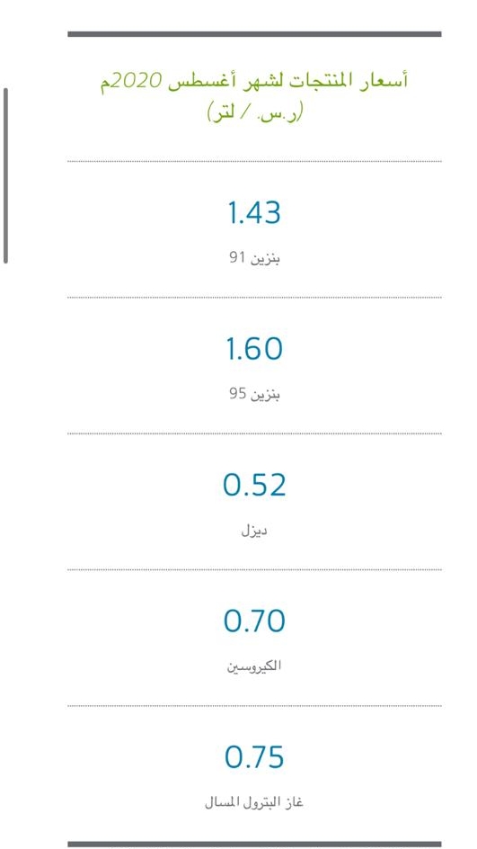 العناوين الفرعية إخفاء 1 التزام أرامكو بتوفير الوقود: 2 اختبارات الجودة: 3 أسعار البنزين الجديدة أعلنت شركة أرامكو عن أسعار البنزين الجديدة، حيث سجل بنزين 91 مبلغ 1.43 ريال بدلًا عن 1.29 ريال، فيما سجل البنزين 95 مبلغ 1.60 بدلًا عن 1.44 ريال. التزام أرامكو بتوفير الوقود: وتوفر أرامكو السعودية أفضل أنواع الوقود لتلبية الاحتياجات اليومية المتجددة للمحركات، حيث يتوفر وقود البنزين بنوعيه 91 و95، لتلبية احتياجات جميع السيارات التي تعمل بالبنزين والمباعة في المملكة، كما يتوفر أيضًا وقود الديزل ذو الجودة العالية للشاحنات والمركبات الأخرى. اختبارات الجودة: وتقول أرامكو: إنه لضمان جودة الوقود طوال دورة إنتاجه من المصدر وحتى وصوله إلى خزان العملاء، يخضع الوقود لاختبارات عديدة وتصدر بشأنه الشهادات؛ كما يتم حقنه بصبغات مختلفة لتسهيل مهمة التعرف عليه بصريًّا والتحكم في جودته أثناء الضخ. أسعار البنزين الجديدة وتمت مراجعة أسعار البنزين في السعودية مرتين في غضون شهر وذلك كاستثناء خلال يوليو الماضي، حيث تمت المراجعة مطلع الشهر الماضي بالتزامن مع بدء تطبيق الزيادة في نسبة ضريبة القيمة المضافة، وتم العمل بهذه الأسعار لمدة 10 أيام، في حين تمت المراجعة الثانية يوم 10 يوليو واستمر العمل بها لمدة شهر كما هو متبع. 1. الرقابة ومكافحة الفساد تباشر 218 قضية منها إيقاف عضو شورى ومحافظ سابق 2. بالأسماء .. إلزام 6 أشخاص برد قرابة 19.3 مليون ريال وتغريمهم 340 ألفًا لتلاعبهم في أسهم النقل الجماعي 3. أرامكو تعلن أسعار البنزين الجديدة: ال91 ب 1.43 ريال و95 ب 1.60 4. 4 مدن تسجل 278 إصابة كورونا جديدة وإجمالي الحالات الحرجة 1824 --------------------------------------------------------------------------------------------------------------------------------------------------------------------------------------------------------------------------------------------------------------------------------------------------------------------------------------------------------------------------------------------------------------------------------------------------------------------------------------------------------------------------------------------------------------------------------------------------------------------------------------------------------------------------------------------------------------------------------------------------------------------------------------------------------------------------------------------------------------------------------------------------------------------------------------------------------------------------------------------------------------------------------------------------------------------------------------------------------------------------------------------------------------------------------------------------------------------------------------------------------------------------------------------------------------------------------------------------------------------------------------------------------------------------------------------------------------------------------------------------------------------------------------------------------------------------------------------------------------------------------------------------------------------------------------------------------------------------------------------------------------------------------------------------------------------------------------------------------------------------------------------------------------------------------------------------------------------------------------------------------------------------------------------------------------------------------------------------------------------------------------------------------------------------------------------------------------------------------------------------------------------------------------------------------------------------------------------------------------------------------------------------------------------------------------------------------------------------------------------------------------------------------------------------------------------------------------------------------------------------------------------------------------------------------------------------------------------------------------------------------------------------------------------------------------------------------------------------------------------------------------------------------------------------------------------------------------------------------------------------------------------------------------------------------------------------------------------------------------------------------------------------------------------------------------------------------------------------------------------------------------------------------------------------------------------------------------------------------------------------------------------------------------------------------------------------------------------------------------------------------------------------------------------------------------------------------------------------------------------------------