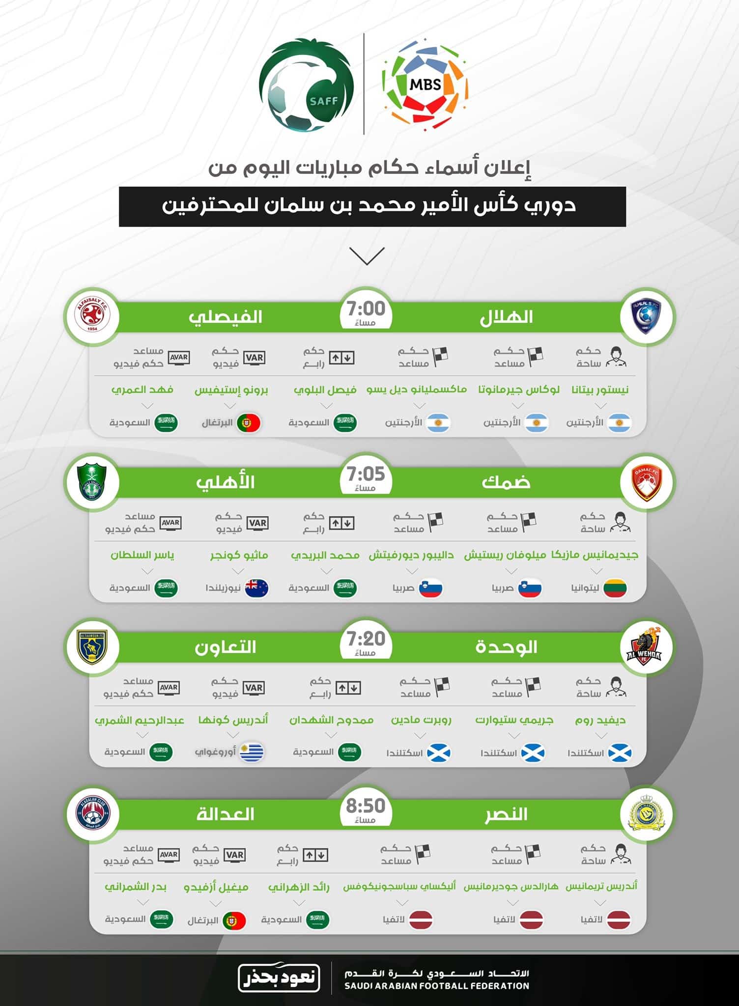 أعلنت لجنة الحكام الرئيسية في الاتحاد السعودي لكرة القدم عن حكام مباريات اليوم في دوري كأس الأمير محمد بن سلمان للمحترفين. مباريات اليوم وتُقام 4 مباريات اليوم في ختام منافسات الجولة ال27 من دوري كأس الأمير محمد بن سلمان للمحترفين، حيث يلعب الهلال مع الفيصلي، ويواجه ضمك فريق الأهلي، ويحل التعاون ضيفًا على الوحدة، ويستضيف النصر فريق العدالة. وكانت مباريات الجولة ال27 قد انطلقت بالأمس، ونجح الاتحاد في استعادة نغمة الانتصارات وفاز على الفيحاء بأربعة أهداف مقابل هدف، فيما اكتسح الاتفاق فريق الرائد برباعية نظيفة، وتجاوز الفتح عقب الحزم بنتيجة 4/3، وتعادل الشباب وأبها، ويمكن الاطلاع عبر الرابط التالي (اضغط هنا). الهلال ضد الفيصلي وتنطلق مباريات اليوم عند الساعة السابعة مساءً بمواجهة الهلال ضد الفيصلي على ملعب جامعة الملك سعود في الرياض، ويسعى الزعيم لمصالحة جماهيره وتحقيق الفوز، فيما يطمح عنابي سدير لخطف الثلاث نقاط. ويدير مباراة الهلال ضد الفيصلي طاقم تحكيم أرجنتيني بقيادة نيستور بيتانا، ويُساعده لوكاس جيرمانوتا وماكسمليانو ديل يسو، والحكم الرابع فيصل البلوي، وحكم الفيديو البرتغالي برونو إستيفيس، ويُساعده فهد العمري. ضمك ضد الوحدة ويقود مباراة ضمك ضد الأهلي الحكم الليتواني جيديمانيس مازيكا، ويُساعده الصربيان ميلوفان ريستيش وداليبور ديورفيتش، والحكم الرابع محمد البريدي، وحكم الفيديو النيوزيلندي ماثيو كونجر، ويُساعده ياسر السلطان. ويلعب ضمك ضد الوحدة على ملعب مدينة الأمير سلطان بن عبدالعزيز في أبها، ويسعى الفريق الضمكاوي لتحقيق الفوز أملًا في البقاء وسط الكبار الموسم المقبل، فيما يطمح الراقي لمواصلة انتصاراته. الوحدة ضد التعاون ومن المقرر أن يقود مباراة الوحدة ضد التعاون طاقم تحكيم إسكتلندي بقيادة ديفيد روم، ويُساعده جريمي ستيوارت وروبرت مادين، والحكم الرابع ممدوح الشهدان، وحكم الفيديو الأوروغوياني أندريس كونها، ويُساعده عبدالرحيم الشمري. ويحتضن ملعب مدينة الملك عبدالعزيز الرياضية في مكةالمكرمة مباراة الوحدة ضد ضمك اليوم، ويطمح فرسان مكة لتحقيق الفوز، فيما يسعى سكري القصيم لإنهاء سلسلة النتائج السلبية وحصد الثلاث نقاط. النصر ضد العدالة وتُختتم مباريات اليوم عند الساعة 8:50 مساءً، بمواجهة النصر ضد العدالة على استاد الملك فهد الدولي في الرياض، ويسعى العالمي لتحقيق الفوز أملًا في تقليص الفارق مع الهلال، فيما يطمح الفريق الضيف لتحقيق نتيجة إيجابية. وعُين طاقم تحكيم من لاتفيا بقيادة أندريس تريمانيس لإدارة مباراة النصر ضد العدالة اليوم، ويُساعده هارالدس جوديرمانيس وأليكساي سباسجونيكوفس، والحكم الرائد رائد الزهراني، وحكم الفيديو البرتغالي ميغيل أزفيدو، ويُساعده بدر الشمراني. مواضيع ذات صلة موعد مباريات اليوم في دوري محمد بن سلمان