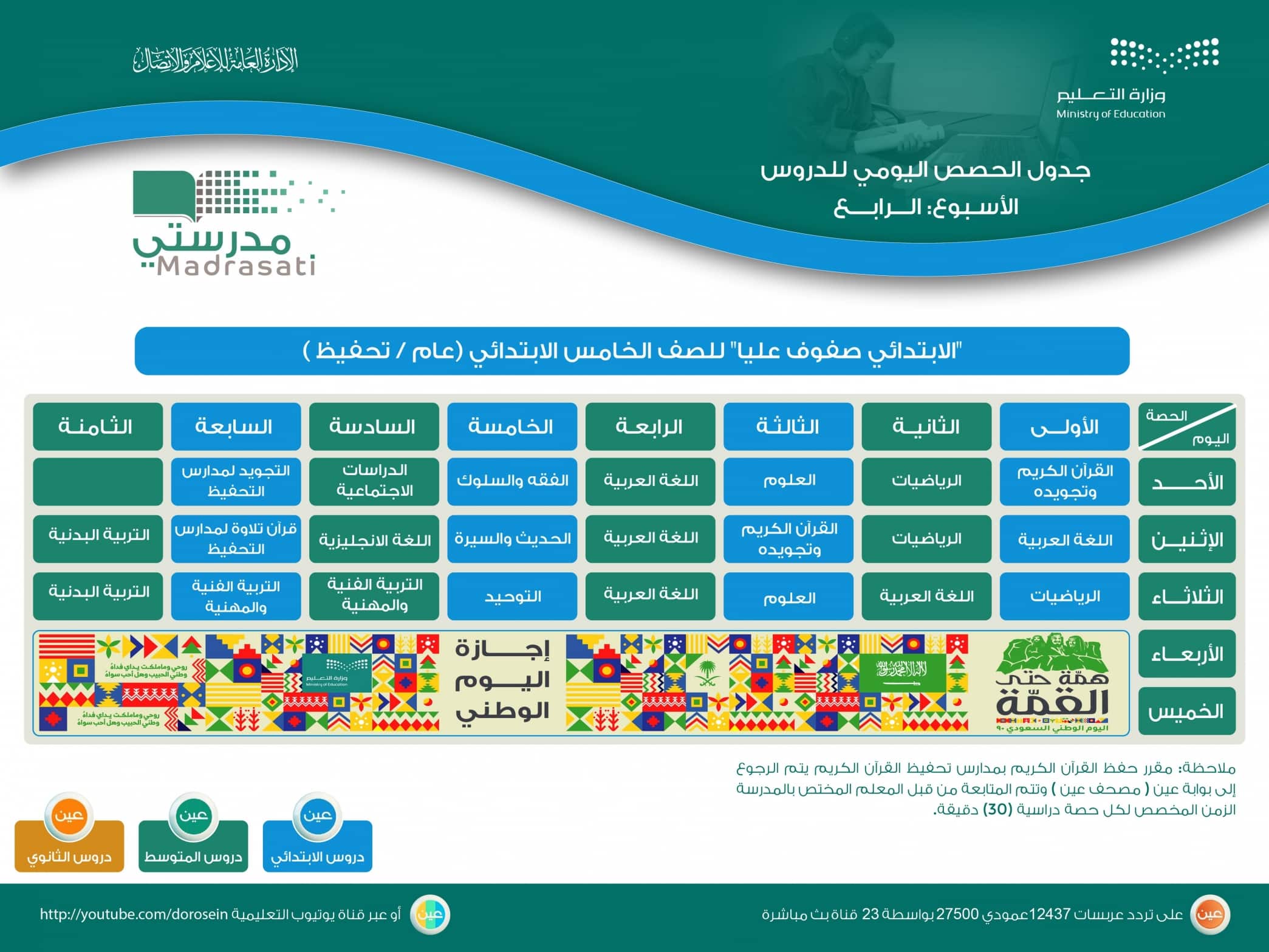 أعلنت وزارة التعليم عن جدول دروس الحصص اليومية للصفوف (الأول والثاني والثالث الابتدائي) من الأسبوع الرابع، عبر قنوات عين على تردد عربسات 12437، في بث مباشر من الساعة 3 عصراً، ويُعاد طوال اليوم، أو عبر رابط القناة على اليوتيوب: هنا. كما أعلنت عن جدول دروس الحصص اليومية للصفوف (الرابع والخامس والسادس الابتدائي) من الأسبوع الرابع، عبر قنوات عين على تردد عربسات 12437، في بث مباشر من الساعة 3 عصراً، ويُعاد طوال اليوم، أو عبر رابط القناة على اليوتيوب: هنا وأيضًا نشرت التعليم عبر تويتر، جدول دروس الحصص اليومية للصفوف (الأول والثاني والثالث المتوسط) من الأسبوع الرابع، عبر قنوات عين على تردد عربسات 12437، في بث مباشر من الساعة 9 صباحاً، ويُعاد طوال اليوم، أو عبر رابط القناة على اليوتيوب: هنا. بالإضافة إلى جدول دروس الحصص اليومية للمرحلة الثانوية (المستوى الأول) من الأسبوع الرابع، عبر قنوات عين على تردد عربسات 12437، في بث مباشر من الساعة 9 صباحاً، ويُعاد طوال اليوم، أو عبر رابط القناة على اليوتيوب: هنا. ونشرت التعليم جدول دروس الحصص اليومية للمرحلة الثانوية (المستوى الثالث) من الأسبوع الرابع، عبر قنوات عين على تردد عربسات 12437، في بث مباشر من الساعة 9 صباحاً، ويُعاد طوال اليوم، أو عبر رابط القناة على اليوتيوب: هنا. كذلك نشرت وزارة التعليم جدول دروس الحصص اليومية للمرحلة الثانوية (المستوى الخامس) من الأسبوع الرابع، عبر قنوات عين على تردد عربسات 12437، في بث مباشر من الساعة 9 صباحاً، ويُعاد طوال اليوم، أو عبر رابط القناة على اليوتيوب: هنا. وأخيرًا جدول دروس الحصص اليومية للمرحلة الثانوية (عام اختياري – تحفيظ اختياري) من الأسبوع الرابع، عبر قنوات عين على تردد عربسات 12437، في بث مباشر من الساعة 9 صباحاً، ويُعاد طوال اليوم، أو عبر رابط القناة على اليوتيوب: هنا. خطوات تحديث قنوات عين: ونشرت قنوات عين في وقت سابق مقطع فيديو يشرح بالتفصيل طريقة ضبط التردد مرة ثانية؛ حيث يتم ضبط تردد جهاز الاستقبال (الرسيفر) من خلال الخطوات التالية: – الدخول على الإعدادات. – اختيار تحديث البرنامج واختيار التحديث اليدوي. – اختيار القمر الصناعي عرب سات. – إدخال التردد 12437 استقطاب عمودي. – اختيار معدل الترميز 27500. – ضبط الإرسال على DVB-S2. – الضغط على أيقونة البحث لتظهر لكم جميع القنوات وعددها 20 قناة للمراحل الدراسية كافة.
