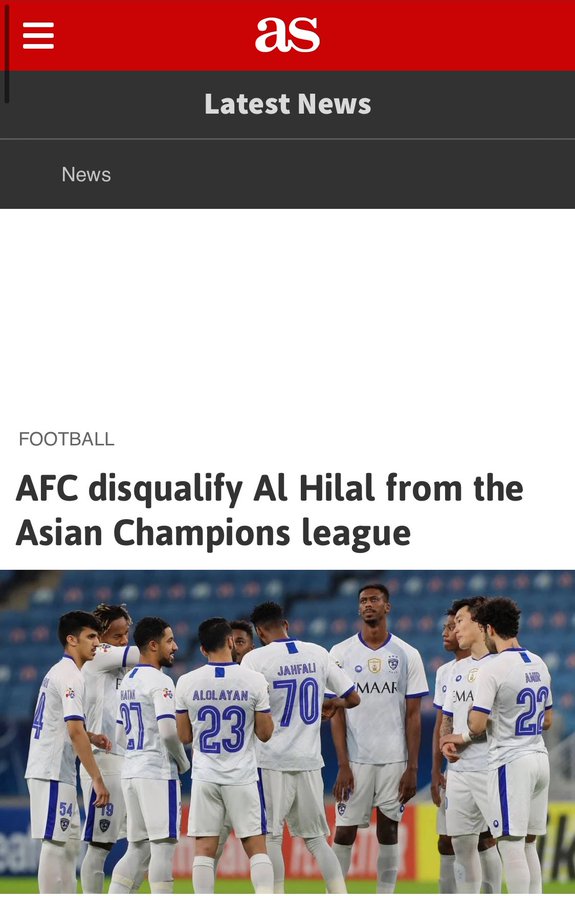 تحدثت أحد أشهر الصحف البيروفية عن إقصاء نادي الهلال من دوري أبطال آسيا بقرار من الاتحاد الآسيوي لكرة القدم، حيث اعتبر الأخير أزرق العاصمة منسحبًا من البطولة بعد أن دخل مباراة شباب أهلي دبي الإماراتي بقائمة مكونة من 11 لاعبًا. وقالت صحيفة Andiana البيروفية إن الاتحاد الآسيوي كان متعنتًا مع الزعيم، ورفض طلب تأجيل مباراة شباب أهلي دبي بسبب الظروف القهرية وإصابات كورونا. وكان بيان الاتحاد الآسيوي حول إقصاء الزعيم جاء كالتالي: "أخفق الأزرق في تقديم اللائحة المطلوبة التي تضم 13 لاعبًا من أجل خوض المباراة ضمن المجموعة الثانية في دوري أبطال آسيا لمنطقة الغرب، أمام شباب الأهلي دبي الإماراتي، وبالتالي تم اعتباره منسحبًا من البطولة". كورونا يحرم الهلال من استكمال مشواره الآسيوي وعلّق موقع GOAL العالمي على استبعاد الهلال قائلًا: "تفشي وباء كورونا يحرم الزعيم من استكمال مشواره الآسيوي والاتحاد القاري يعتبره منسحبًا". أما شبكة بي بي سي البريطانية الشهيرة فقالت: "الهلال يُودع دوري الأبطال ويفقد الفرصة في الدفاع عن لقبه بسبب قائمة ال11 لاعبًا". لقاء سابق بين الزعيم وشباب الأهلي بينما قالت صحيفة ماركا الإسبانية: "قائمة ال11 لاعبًا تتسبب في إبعاد الزعيم عن بطولته المفضلة". أما صحيفة أس الإسبانية فعلقت قائلة: "الاتحاد الآسيوي يُقصي الهلال من دوري أبطال آسيا". وكانت مباراة الزعيم ضد شباب أهلي دبي الإماراتي تم إلغاؤها قبل إصدار قرار من الاتحاد الآسيوي باعتبار الأزرق منسحبًا من البطولة. الأزرق آخر بطل مُتوج في دوري الأبطال يذكر أن أزرق العاصمة تُوج بلقب دوري أبطال آسيا عام 2019 على حساب فريق أوراوا الياباني.