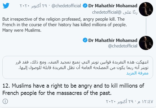 العناوين الفرعية إخفاء 1 تغريدة مهاتير محمد 2 الخارجية تُدين هجوم نيس وصف موقع التواصل "تويتر"، التغريدة التي نشرها رئيس الوزراء الماليزي السابق، مهاتير محمد بشأن هجوم نيس الإرهابي، بأنّها انتهكت قوانين تويتر التي تمنع تمجيد العنف. تغريدة مهاتير محمد وبالرغم من أنّ تويتر عارض تغريدة مهاتير محمد، الخاصة بدعم قتل الفرنسيين، تحديدًا بعد هجوم نيس الإرهابي، إلا أنّه قرر عدم حذفها، معللا بأنّه قد يكون من المصلحة العامة أن يتم الوصول إلى التغريدة. ونشر رئيس وزراء ماليزيا السابق، مهاتير محمد، سلسلة تغريدات أيد فيها ضمنيًا قتل ملايين الفرنسيين، في خطوة قد تؤجج الوضع المتوتر أصلًا في فرنسا. وكتب مهاتير محمد على حسابه الرسمي بموقع "تويتر":" إن لدى المسلمين الحق في الغضب وفي قتل ملايين من الشعب الفرنسي انتقامًا من مذابح الماضي". وكان هذا التعليق ضمن 13 تغريدة كتبها السياسي الماليزي المخضرم، عن الهجوم الدامي في فرنسا. وقال رئيس الوزراء الماليزي السابق: "إنه بما أنك (يقصد إيمانويل ماكرون) تحمّل الإسلام والمسلمين ما فعله شخص غاضب، فمن حق المسلمين معاقبة فرنسا (...)". واستعرض مهاتير خلال التغريدات بداية التوتر الذي تعيشه فرنسا حاليًا منذ ذبح أستاذ التاريخ والجغرافيا، صمويل باتي، بقطع رأسه قرب باريس في وقت سابق من أكتوبر الجاري. وهاجم مهاتير محمد، الرئيس الفرنسي، إيمانيول ماكرون، قائلًا: "إنه ساذج للغاية في لوم الإسلام والمسلمين عن جريمة مقتل المعلم". وقال: "إن الغرب لم يعدوا متمسكين بدينهم، إنهم مسيحيون بالاسم فقط، وهذا حقهم، لكن لا يجب عليهم إظهار عدم احترام قيم الآخرين ودينهم". وتابع مهاتير:" إن القاتل كان غاضبًا من قيام المدرس الفرنسي بنشر رسوم مسيئة للرسول محمد". وأضاف أنه لا يوافق على قتل المدرس، ويؤيد حرية الرأي والتعبير، لكنها لا تتضمن إهانة الآخرين. الخارجية تُدين هجوم نيس وكانت وزارة الخارجية، أعربت عن إدانة المملكة العربية السعودية واستنكارها الشديدين، للهجوم الإرهابي الذي وقع بالقرب من كنسية نوتردام في مدينة نيس الفرنسية، وأسفر عن مقتل وإصابة عدد من الأشخاص. وجددت الوزارة التأكيد على رفض المملكة القاطع لمثل هذه الأعمال المتطرفة التي تتنافى مع جميع الديانات والمعتقدات الإنسانية والفطرة الإنسانية السليمة، مؤكدة في الوقت نفسه، على أهمية نبذ الممارسات التي تولد الكراهية والعنف والتطرف. كما عبرت الوزارة عن العزاء والمواساة لذوي الضحايا وللحكومة والشعب الفرنسي الصديق، مع التمنيات للمصابين بالشفاء العاجل. ذات صلة : 1. مركز الملك سلمان للإغاثة يكافح العمى في السودان ونيجيريا 2. كبار العلماء تدين هجوم نيس : الإرهاب مدان أيًا كان مصدره وتحت أي ذريعة 3. عوض خميس يُنافس على الأفضل دفاعيًا في آسيا 2020 4. إذا أردت النوم إياك أن تفعل هذا الأمر " المزيد من الاخبار المتعلقة :