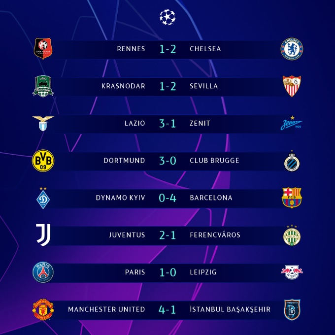 أُقيمت 8 مباريات الثلاثاء ضمن منافسات الجولة الرابعة من مرحلة المجموعات في بطولة دوري أبطال أوروبا، وانتهت جميعها بتحقيق الفوز. دوري أبطال أوروبا: وانطلقت مباريات الثلاثاء بمواجهة الفريق الأول لكرة القدم بنادي رين ضد تشيلسي وانتهت بتحقيق البلوز لفوز هام خارج ملعب بهدفين مقابل هدف، سجلهم؛ كالوم هودسون أودوي وأوليفييه جيرو، وأحرز سيرهو جيراسي هدف الفريق الفرنسي. لاعبو تشيلسي وتمكن الفريق الأول لكرة القدم بنادي إشبيلية من الفوز على مضيفه كراسنودار في دوري أبطال أوروبا بنتيجة 2/ 1، وسجل ثنائية الفريق الأندلسي إيفان راكيتيتش ومنير الحدادي، فيما أحرز واندرسون كامبوس هدف فريقه الوحيد. لاعبو إشبيلية وتغلب الفريق الأول لكرة القدم بنادي بوروسيا دورتموند على ضيفه كلوب بروج بثلاثية نظيفة، سجلها؛ جادون سانشو وثنائية للاعب إيرلينج هالاند، وفاز باريس سان جيرمان على لايبزيج بهدف نظيف سجله نيمار دا سيلفا. احتفال لاعبو سان جيرمان وفاز الفريق الأول لكرة القدم بنادي يوفنتوس على ضيفه فيرينكفاروسي المجري بهدفين مقابل هدف، وسجل ثنائي اليوفي كريستيانو رونالدو وألفارو موراتا، وأحرز ميرتو أوزوني هدف فريقه. لاعبو اليوفي ونجح الفريق الأول لكرة القدم بنادي لاتسيو في الفوز على زينيت بنتيجة 3/ 1، سجل ثلاثية الفريق الإيطالي، ماركو بارولو وثنائي للاعب تشيرو إيموبيلي، فيما تمكن أرتيم دزيوبا من تسجيل هدف فريقه الوحيد. لاعبو لاتسيو برشلونة ويونايتد يفوزان بالأربعة: انتهت مباراة الفريق الأول لكرة القدم بنادي دينامو كييف ضد نظيره برشلونة في دوري أبطال أوروبا بفوز البارشا برباعية دون رد سجلها في الشوط الثاني عن طريق سيرجينو ديست وأنطوان جريزمان، وثنائية للاعبه مارتين برايثوايت. لاعبو برشلونة وظهر مانشستر يونايتد بشكل مميز ضد إسطنبول باشاكشهر، ونجح في الفوز برباعية مقابل هدف، سجلها ماركوس راشفورد ودانيال جاميس، بجانب ثنائية للاعبه برونو فرنانديز، فيما أحرز هدف الفريق التركي دنيز توروك. لاعبو مانشستر يونايتد نتائج المباريات