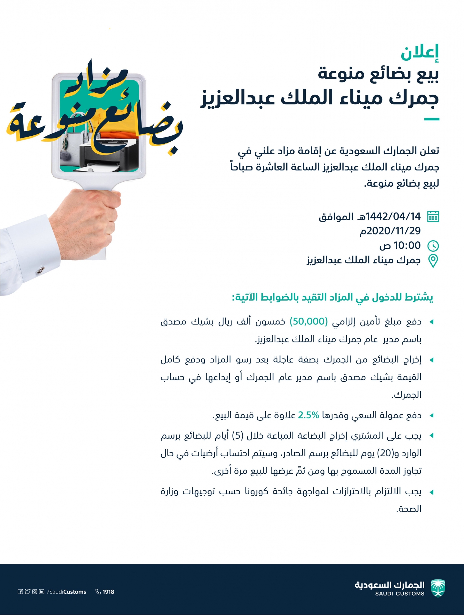 أعلنت الجمارك السعودية عن إقامة مزاد علني في جمرك ميناء الملك عبدالعزيز لبيع بضائع منوّعة، وفقًا لنظام الجمارك الموحد. وأضافت أن المزاد سيقام بعد غد الأحد، في تمام العاشرة صباحًا بجمرك ميناء الملك عبدالعزيز، مشترطة على المتقدم في المزاد دفع مبلغ تأمين إلزامي قدره 50 ألف ريال بشيك مصدق باسم مدير عام جمرك ميناء الملك عبدالعزيز. وأوضحت أنه يشترط إخراج البضائع من الجمرك بصفة عاجلة بعد رسو المزاد ودفع كامل القيمة بشيك مصدق باسم مدير عام الجمرك أو إيداعها في حساب الجمرك، بالإضافة لدفع عمولة السعي وقدرها 2.5% علاوة على قيمة البيع. ولفتت إلى أنه يجب على المشتري إخراج البضاعة المبيعة خلال 5 أيام للبضائع برسم الوارد، و20 يومًا للبضائع برسم الصادر، وسيتم سحب أرضيات في حال تجاوز المدة المسموح بها، ومن ثم عرضها للبيع مرة أخرى، مشددة على ضرورة الالتزام بالاحترازات لمواجهة جائحة كورونا حسب توجيهات وزارة الصحة. الجمارك السعودية ذات صلة : 1. موعد مباراة الهلال ضد النصر والقنوات الناقلة 2. سيل من التغييرات يحدث في نهائي دوري أبطال إفريقيا 3. العنف الأسري : تصوير الآخرين وتداول صورهم من التنمر الإلكتروني 4. شاهد.. جريان سيل من البرد جنوب غرب القصيم " المزيد من الاخبار المتعلقة :