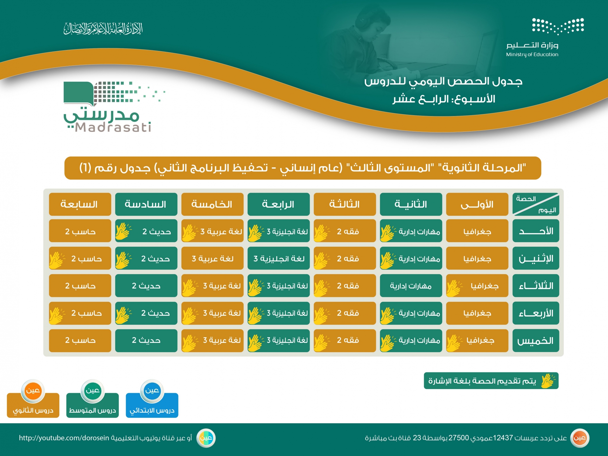 نشرت وزارة التعليم جداول دروس الحصص اليومية من الأسبوع الرابع عشر للصفوف (الأول والثاني والثالث الابتدائي والرابع والخامس والسادس الابتدائي) من الأسبوع الرابع عشر، عبر قنوات عين على تردد عربسات 12437، في بث مباشر من الساعة 3 عصرًا، ويُعاد طوال اليوم، أو عبر رابط القناة على اليوتيوب: http://youtube.com/dorosien كما نشرت الوزارة جدول دروس الحصص اليومية للصفوف (الأول والثاني والثالث المتوسط) والمرحلة الثانوية (المستوى الأول والثالث والخامس) من الأسبوع الرابع عشر، عبر قنوات عين في بث مباشر من الساعة 9 صباحًا، ويُعاد طوال اليوم. ونشرت وزارة التعليم جدول دروس الحصص اليومية للمرحلة الثانوية (عام اختياري – تحفيظ اختياري) من الأسبوع الرابع عشر، عبر قنوات عين على تردد عربسات 12437، في بث مباشر من الساعة 9 صباحًا، ويُعاد طوال اليوم، أو عبر رابط القناة على اليوتيوب: http://youtube.com/dorosien