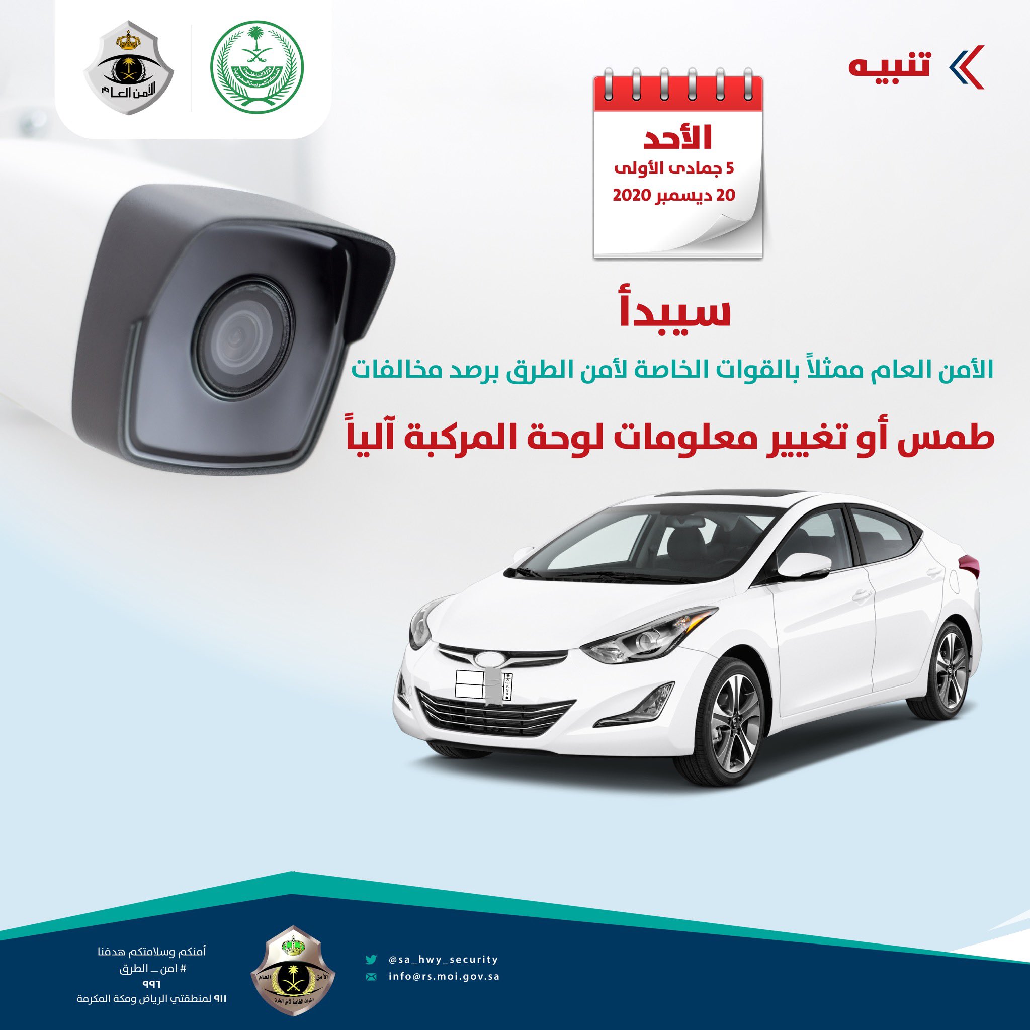 حددت القوات الخاصة لأمن الطرق موعد تطبيق الرصد الآلي لمخالفات طمس أو تغيير معلومات لوحة المركبة. وقال أمن الطرق، في بيان عبر "تويتر": "تنبيه.. سعيًا لرفع مستوى السلامة المرورية، سيبدأ تطبيق الرصد الآلي لمخالفات طمس أو تغيير معلومات لوحة المركبة اعتبارًا من يوم الأحد 1442/5/5 الموافق 20 ديسمبر 2020.