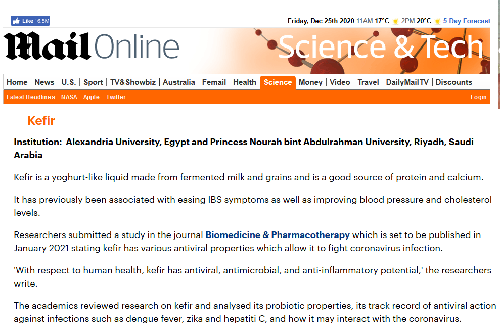 يعمل العلماء على استكشاف اللقاحات والأدوية للعلاج والوقاية من فيروس كورونا، وأحد السبل التي يستكشفها الأكاديميون أيضًا هو دور علوم الأغذية والتغذية، وقد توصل الباحثون في جامعة الأميرة نورة بنت عبد الرحمن، وجامعة الإسكندرية في مصر إلى دور الكفير في الوقاية من الوباء، بحسب صحيفة ديلي ميل البريطانية. والكفير هو سائل يشبه الزبادي مصنوع من الحليب وهو مصدر جيد للبروتين والكالسيوم، وقد ارتبط سابقًا بتخفيف أعراض القولون العصبي وكذلك تحسين ضغط الدم ومستويات الكوليسترول. ونشر الباحثون في الجامعة السعودية والجامعة المصرية دراستهم في مجلة Biomedicine & Pharmacotherapy المرموقة والتي من المقرر إصدارها في يناير 2021، وقالوا إن الكفير له العديد من الخصائص المضادة للفيروسات الأمر الذي يسمح له بمكافحة عدوى فيروس كورونا، كما أن لديه إمكانات مضادة للفيروسات والميكروبات والالتهابات. دور الكفير في الوقاية من فيروس كورونا وراجع الأكاديميون الأبحاث التي أُجريت على الكفير وحللوا خصائصه الحيوية، وسجله الحافل في الإجراءات المضادة للفيروسات وضد العدوى مثل حمى الضنك، وفيروس زيكا، والتهاب الكبد سي، وكيف قد يتفاعل مع فيروس كورونا. وقالت الدراسة: أحد أخطر جوانب فيروس كوفيد-19 هو أن جهاز المناعة قد يفسد وينتج جزيئات تسمى السيتوكينات والتي تسبب التهابًا شديدًا ويمكن أن تكون قاتلة إذا تركت دون رادع. وتابعوا أن الكفير يمكن أن يعمل كعامل مضاد للالتهابات، وبالتالي قد يكون مثبطًا مهمًا للسيتوكينات التي تساهم في تقوية ودعم كوفيد-19. واستنادًا إلى جميع الدراسات التي أجريت على الكفير وميكروباته الحيوية، خلصوا إلى أنه يعمل كعامل وقائي ضد الالتهابات الفيروسية. وقالت الدكتورة سارة بيري، الخبيرة في علوم التغذية في جامعة كينجز لندن كوليدج، إن الكفير غني بالبروبيوتيك الذي يعزز الاستجابة المناعية ضد الميكروبات والفطريات والفيروسات ويقلل من الاستجابة الالتهابية، لذلك من المهم تناوله لدوره في الوقاية من وباء كورونا.
