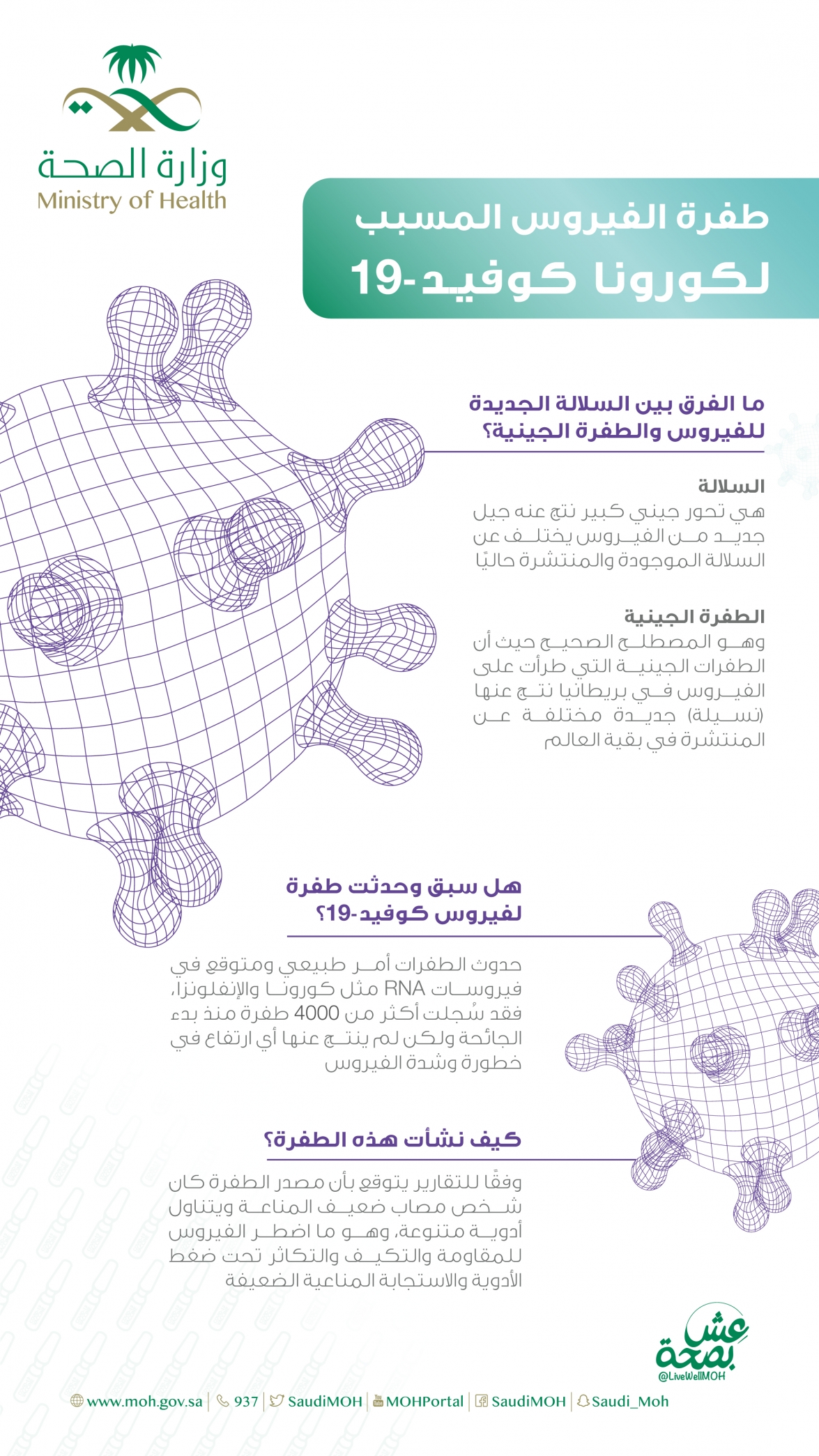 أوضحت وزارة الصحة الفرق بين السلالة الجديدة لفيروس كورونا المستجد "كوفيد 19′′، والطفرة الجينية. السلالة : هي تحور جيني كبير نتج عنه جيل جديد من الفيروس يختلف عن السلالة الموجودة والمنتشرة حاليًا. الطفرة الجينية: وهو المصطلح الصحيح حيث إن الطفرات الجينية التي طرأت على الفيروس في بريطانيا نتج عنها "نسيلة" جديدة مختلفة عن المنتشرة في بقية العالم. وفي وقت سابق، أعلنت وزارة الصحة أنه تم رصد 10 حالات لفيروس كورونا المتحور في المملكة وتماثلوا للشفاء جميعًا. وقال المتحدث الرسمي باسم وزارة الصحة الدكتور محمد العبدالعالي إنه لم يثبت أي ارتباط بين هذا التحور ومستوى المرض وقوّته، واللقاحات مؤثرة وفعالة حتى مع مثل هذه التحورات. وأشار متحدث الصحة إلى انخفاض عدد الإصابات بفيروس كورونا المستجد في السعودية بنحو 98 % لافتًا إلى أنه تم تسجيل أكثر من مليون شخص للحصول على لقاح كورونا. وتابع العبدالعالي أنه لم تُرصد أي مشاكل صحية لمن تلقّوا اللقاح.