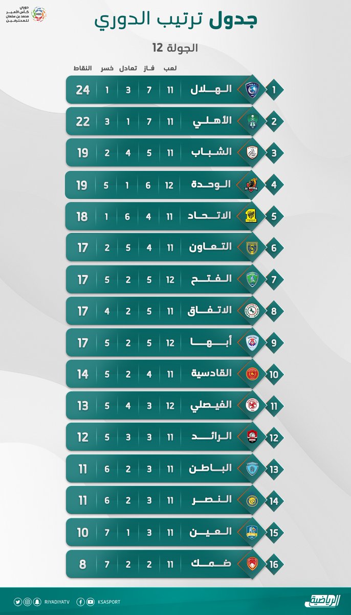 أُسدل الستار على نتيجة مباراتي اليوم الخميس بالجولة الثانية عشرة من دوري محمد بن سلمان للمحترفين موسم 2020/2021. وكانت المباراة الأولى أُقيمت عصر اليوم بين فريقي أبها والفيصلي حيث انتهت بفوز أبها بهدف دون رد، أما المباراة الثانية فشهدت تعادلًا سلبيًا بين فريقي الوحدة والفتح. الهلال في صدارة دوري محمد بن سلمان للمحترفين ويتواجد الهلال في صدارة دوري المحترفين برصيد 24 نقطة، بينما يحتل الأهلي المركز الثاني برصيد 22 نقطة، أما الشباب والوحدة فيحتل كل منهما المركزين الثالث والرابع على الترتيب برصيد 19 نقطة. أما الاتحاد فيحتل المركز الخامس برصيد 18 نقطة، بينما يتواجد التعاون بالمركز السادس برصيد 17 نقطة، أما الفتح والاتفاق وأبها فيحتل كل منهم المراكز السابع والثامن والتاسع على الترتيب برصيد 17 نقطة. ويتواجد القادسية بالمركز العاشر برصيد 14 نقطة، بينما يحتل الفيصلي المركز الحادي عشر برصيد 13 نقطة. ترتيب آخر 5 فرق في جدول الدوري ويتواجد الرائد بالمركز الثاني عشر برصيد 12 نقطة، أما فريقا الباطن والنصر فيحتلان المركزين الثالث عشر والرابع عشر على الترتيب برصيد 11 نقطة، أما العين فيتواجد بالمركز الخامس عشر برصيد 10 نقاط وضمك بالمركز السادس عشر برصيد ثماني نقاط. وتُقام غدًا الجمعة 3 مباريات حيث يلعب الباطن ضد الهلال، بينما يلعب القادسية مع الأهلي، والنصر مع نادي العين.