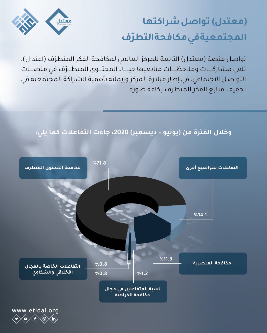 العناوين الفرعية 1 مكافحة العنصرية: 2 نافذة معتدل: 3 مكافحة الفكر المتطرف: أكد المركز العالمي لمكافحة الفكر المتطرّف (اعتدال) أن رفض الفكر المتطرف تصدر التفاعلات مع نافذة (معتدل)، خلال الفترة من يونيو إلى ديسمبر 2020 بنسبة 71.8%. مكافحة العنصرية: وتابع مركز اعتدال، في تغريدة له عبر حسابه بموقع تويتر، اليوم الجمعة، أنه بلغت نسبة التفاعل مع مكافحة العنصرية 11.3%. نافذة معتدل: وإيمانًا بالشراكة المجتمعية في مكافحة الفكر المتطرف، ولكون الوقاية تبدأ من تحديد بؤر التطرف أطلق اعتدال أيقونة جديدة باللغتين العربية والإنجليزية، تحت مسمى معتدل، لأجل مشاركة الملاحظات حيال المحتوى المتطرف، المتداول عبر منصات التواصل الاجتماعي، بهدف المكاشفة بشأنه والحد من انتشاره، وذلك في سبيل مواصلة نشر وتعزيز ثقافة الاعتدال. مكافحة الفكر المتطرف: ويهدف مركز اعتدال إلى أن يكون المرجع الأول عالميًّا في مكافحة الفكر المتطرف وتعزيز ثقافة الاعتدال، وذلك من خلال رصد وتحليل الفكر المتطرف واستشرافه للتصدي له ومواجهته والوقاية منه، والتعاون مع الحكومات والمنظمات ذات العلاقة. ويهدف المركز كذلك إلى تفنيد الخطاب المتطرف ومحاربة أنشطته والحد من آثارها ومواجهة الفكر المتطرف ومنع الانتماء إليه أو التعاطف معه أو المساهمة في أنشطته بأي شكل من الأشكال، وتعزيز ثقافة الاعتدال والتسامح وتقبل الآخر وتعزيز التعاون الدولي في مكافحة الفكر المتطرف. ذات صلة : 1. إصابة عمر السومة تفتح الطريق ل الأهلي لضم صفقة مهمة 2. فريق طبي بالحرس الوطني يجري أول قسطرة فيستولا لمريض الكلى 3. كاراجر: لاعبو ليفربول سيقاتلون بحياتهم للتأهل ل دوري الأبطال بهذه الحالة 4. الملك سلمان ومحمد بن سلمان يهنئان رئيس إفريقيا الوسطى بمناسبة إعادة انتخابه " المزيد من الاخبار المتعلقة :