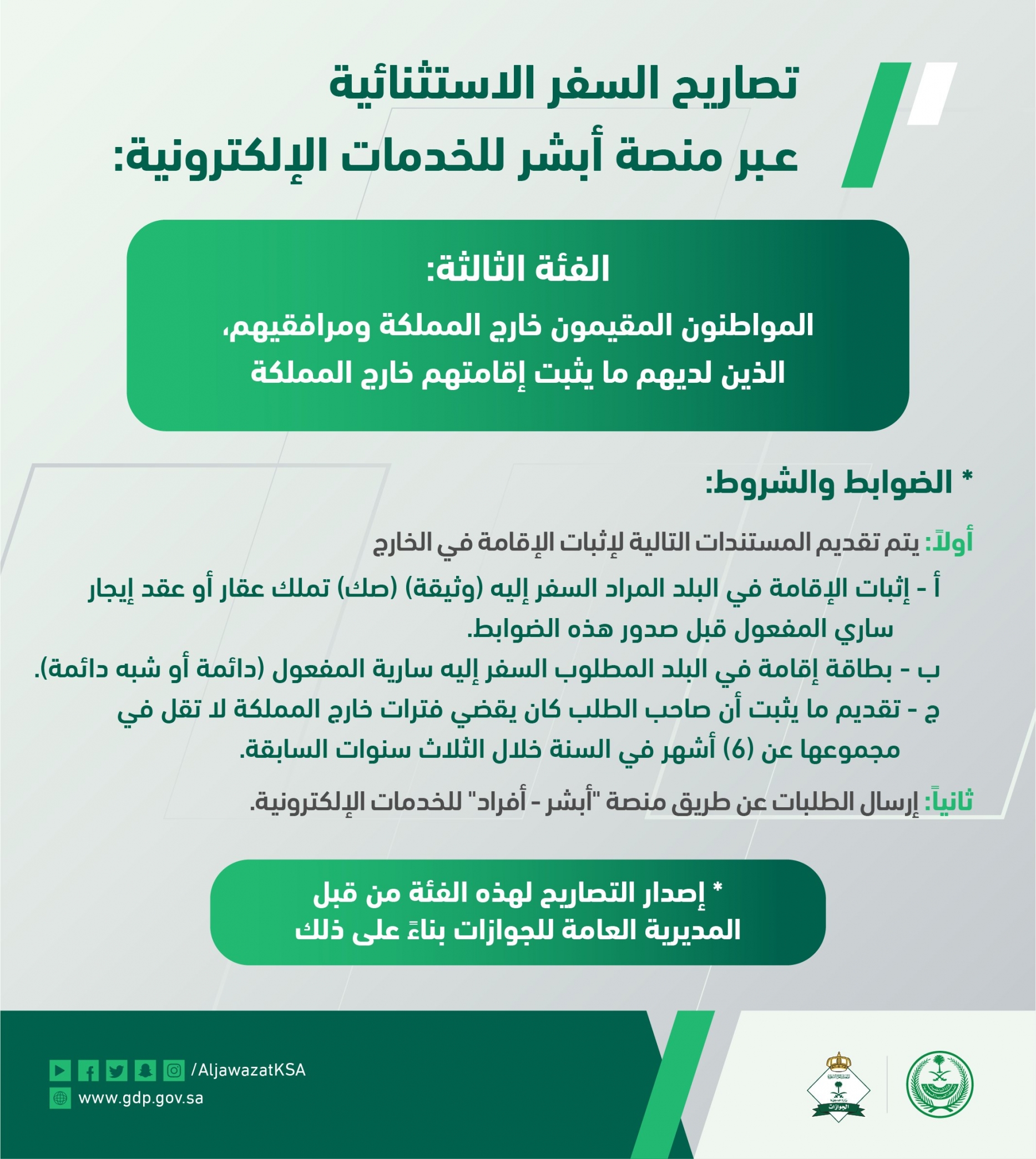 أعادت الجوازات السعودية التذكير بالضوابط والشروط المتعلقة بالحصول على تصاريح السفر للفئات الاستثنائية عبر منصة أبشر للخدمات الإلكترونية، وذلك للمواطنين المقيمين خارج المملكة ومرافقيهم، الذين لديهم ما يثبت إقامتهم بالخارج. أولًا: بالنسبة للموظفين الحكوميين وأكدت الجوازات أن الفئة الأولى المستثناة هم، الموظفون الحكوميون، المدنيون والعسكريون، المكلفون بمهمات رسمية خارج المملكة. الضوابط والشروط وأوضحت الجوازات أن هناك عددًا من الضوابط والشروط التي يجب تحققها لإصدار تصاريح السفر عبر أبشر لهذه الفئات الاستثنائية، وهي: 1. تعذر تأدية المهمة الرسمية عن بعد. 2. ألّا تكون المهمة مرتبطة بموعد يمكن تأجيله. 3. أن تكون المشاركة في أضيق نطاق. المستندات المطلوب إرفاقها وبينت الجوازات أن المستندات المطلوب إرفاقها للحصول على التصاريح تشمل ما يلي: * تقديم خطاب من المسؤول الأول في الجهة. * تحديد أسماء المكلفين بالمهمة. * تحديد المهمة، ومقرها، ومدتها، وما يفيد باستيفاء الشروط المشار إليها. * إرسال الطلبات عن طريق منصة أبشر أفراد للخدمات الإلكترونية. ثانيًا: بالنسبة للمواطنين ومرافقيهم أما بالنسبة للمواطنين المقيمين خارج المملكة ومرافقيهم، الذين لديهم ما يثبت إقامتهم بالخارج فقد حددت الجوازات عددًا من الضوابط والشروط على النحو التالي: 1. إثبات الإقامة في البلد المراد السفر إليه (وثيقة أو صك تملّك عقار أو عقد إيجار ساري المفعول قبل صدور هذه الضوابط). 2. بطاقة إقامة في البلد المطلوب السفر إليه سارية المفعول (دائمة أو شبه دائمة). 3. تقديم ما يثبت أن صاحب الطلب كان يقضي فترات خارج المملكة لا تقل في مجموعها عن 6 أشهر في السنة خلال الثلاث سنوات السابقة. 4. يتم إرسال الطلبات عن طريق منصة أبشر الأفراد للخدمات الإلكترونية. ثالثا: خطوات الحصول على تصاريح السفر للفئات الاستثنائية وحددت الجوازات السعودية عددًا من الخطوات للحصول على تصاريح السفر للفئات الاستثنائية عبر منصة أبشر كالتالي: 1. الدخول إلى حساب المستفيد في منصة أبشر. 2. الضغط على أيقونة خدمات واختيار الجوازات. 3. اختيار مركز الرسائل والطلبات للجوازات. 4. اختيار القطاع الحكومي المطلوب. 5. اختيار جهة إصدار التصريح. 6. اختيار خدمة تصاريح الجوازات 7. إرفاق الوثائق والمستندات المطلوبة، التي تختلف باختلاف نوع الطلب. 8. ثم الضغط على أيقونة تقديم الطلب. 9. ستصلك رسالة برقم الطلب ومعالجته. المصدر: @aljawazatksa