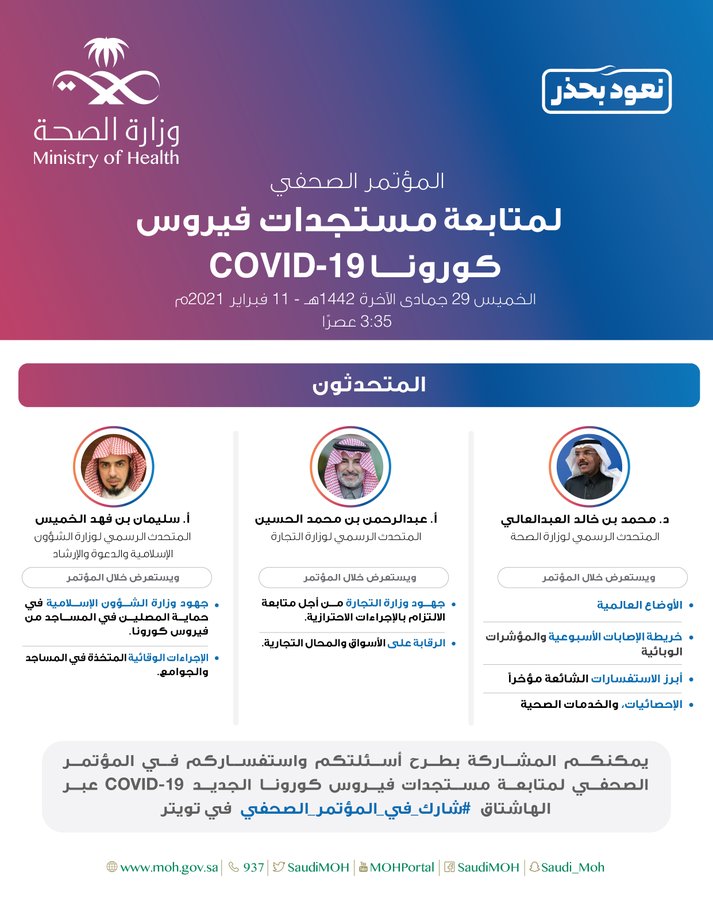 أعلنت وزارة الصحة عن تفاصيل المتحدثين وأهم مواضيع المؤتمر الصحفي لمستجدات فيروس كورونا (كوفيد-19) ليوم غدٍ الخميس الموافق 11 فبراير 2021. وتعقد وزارة الصحة غدًا الخميس، المؤتمر الصحفي الدوري بشأن مستجدات فيروس كورونا (كوفيد-19) عند الساعة 3:35 عصرًا. ومن المقرر أن يستعرض المتحدث الرسمي لوزارة الصحة، الدكتور محمد العبدالعالي، خلال المؤتمر الأوضاع العالمية للجائحة، وخريطة الإصابات الأسبوعية والمؤشرات الوبائية، والمنحنى الوبائي، وأبرز الاستفسارات الشائعة خلال أسبوع، والإحصائيات والخدمات الصحية. ويستعرض عبدالرحمن بن محمد الحسين، المتحدث الرسمي لوزارة التجارة، جهود الوزارة من أجل متابعة الالتزام بالإجراءات الاحترازية، والرقابة على الأسواق والمحلات التجارية. ويناقش سليمان بن فهد الخميس، المتحدث الرسمي لوزارة الشؤون الإسلامية والدعوة والإرشاد، جهود الوزارة في حماية المصلين في المساجد من فيروس كورونا، والإجراءات الوقائية المتخذة في المساجد والجوامع. " المزيد من الاخبار المتعلقة :