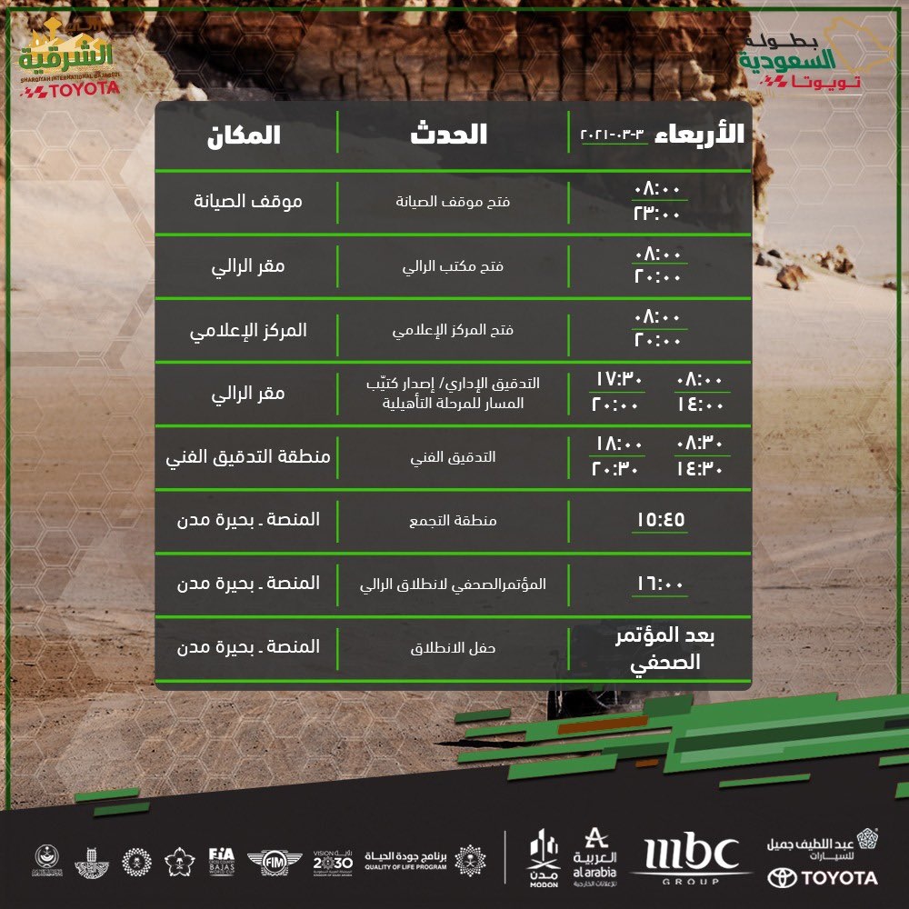 رالي الشرقية – المصدر @SAMF_GOV وجاءت الفئات المشاركة في الرالي كالتالي؛ 4 للسيارات، وهي؛ "تي1" النموذجية، "تي2" الإنتاج التجاري، "تي3′′ السيارات الصحراوية الخفيفة النموذجية و"تي4" للسيارات الصحراوية الخفيفة من الإنتاج التجاري، بجانب "تي5" للشاحنات، وفئتي الدراجات النارية والدراجات رباعية العجلات "كوادز". ويُعد رالي الشرقية تويوتا الدولي ضمن الجولة الأولى من منافسات بطولة السعودية تويوتا للراليات الصحراوية 2021، كما أنه سيكون الظهور الأول له في جدول جولات بطولة كأس العالم لراليات الباها 2021، بعد اعتماده بشكل رسمي. لقطة من الرالي – المصدر @SAMF_GOV منافسات الرالي – المصدر @SAMF_GOV جانب من الرالي – المصدر @SAMF_GOV