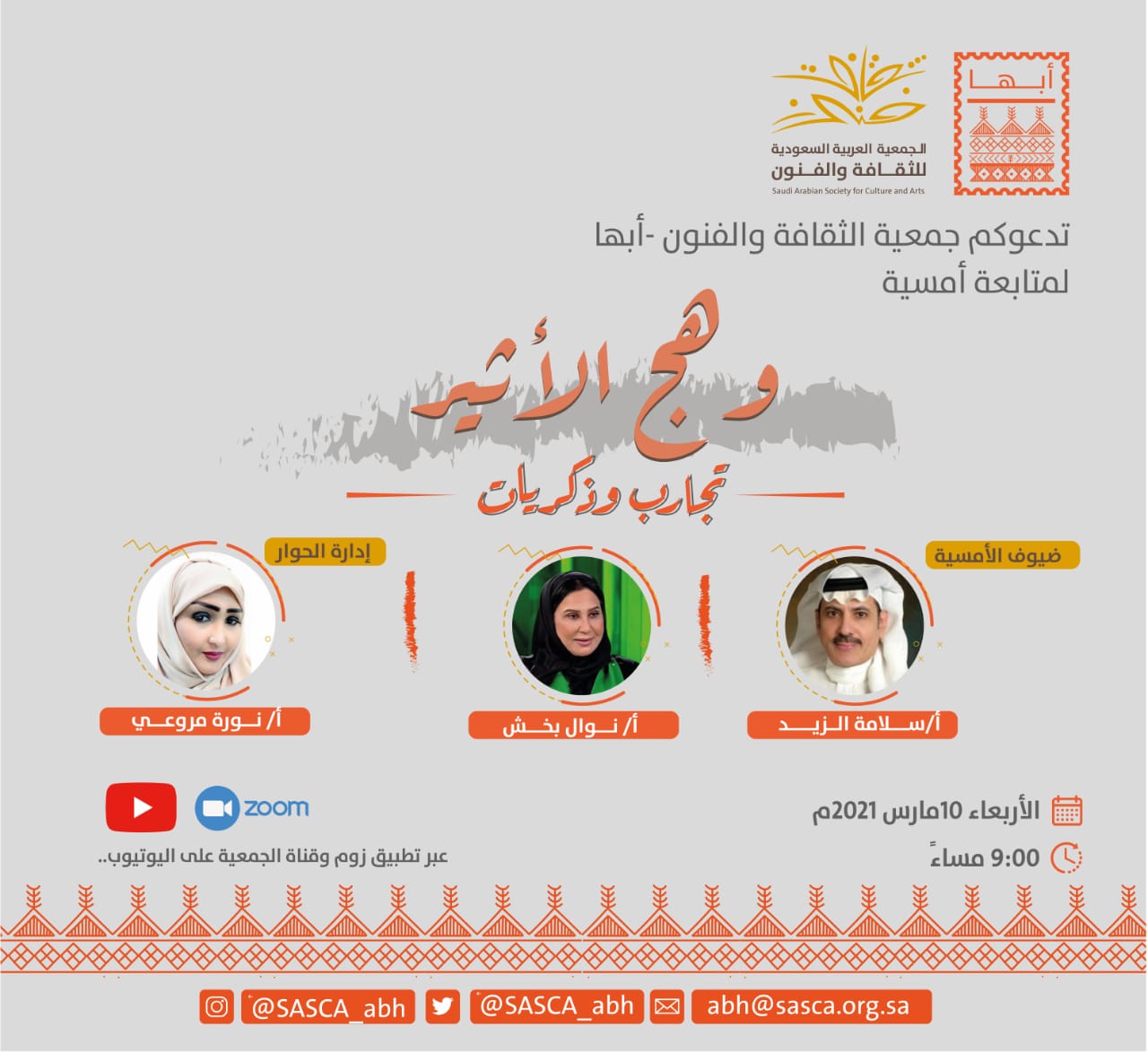 تنظم جمعية الثقافة والفنون بأبها يوم غد الأربعاء، أمسية " وهج الأثير.. تجارب وذكريات " يتحدث فيها الإذاعي سلامة الزيد والإذاعية نوال بخش، حيث سيتحدثان عن تجربتهما في العمل الإذاعي منذ عقود طويلة وإبراز محطاتهم العملية التي أصبحت نموذجاً وطنياً في العمل الإعلامي، وتحاورهما الإعلامية نورة مروعي. ضيوف الأمسية الثقافية وبين مدير الجمعية أحمد السروي أن سيرة ضيوف الأمسية حافلة بعدد من المنعطفات التاريخية التي شهدتها المملكة عبر الأثير من خلال إذاعة الرياض و إذاعة جدة واللتان كانتا مصدر وحيد للمتعة الأثيرية وما زالت لها ذات التأثير والحضور المميز. نقل الأمسية بالاتصال المرئي وأشار السروي إلى أن الأمسية ستنقل عبر الاتصال المرئي ليلتقي الجمهور بشكل مباشر مع الضيوف فيما سيتم نقلها عبر قناة الجمعية على اليوتيوب .