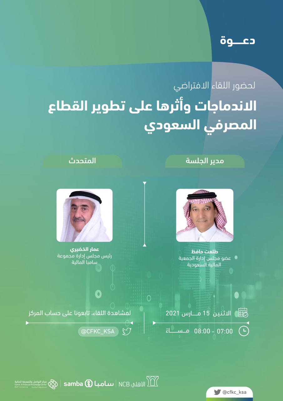 يعقد مركز التواصل والمعرفة المالي "متمم" (مبادرة وزارة المالية) لقاءً افتراضياً بعنوان: "الاندماجات وأثرها على تطوير القطاع المصرفي السعودي" وذلك مساء يوم غد الاثنين ضمن سلسلةٍ من اللقاءات الافتراضية التي يقيمها المركز من أجل إضفاء المعرفة المالية والاقتصادية. تحديات وصعوبات: ويناقش اللقاء الذي سيشهد مشاركة رئيس مجلس إدارة مجموعة سامبا المالية المهندس عمار بن عبدالواحد الخضيري، ويديره عضو مجلس إدارة الجمعية المالية السعودية طلعت حافظ، فكرة الاندماج بين البنك الأهلي السعودي ومجموعة سامبا المالية، والتحديات والصعوبات التي برزت أثناء مراحل الاندماج، بالإضافة إلى تأثير هذا الاندماج على القطاع المصرفي السعودي ككل. اندماج الأهلي وسامبا: ويأتي هذا اللقاء بعد إبرام اتفاقية اندماج ملزمة بين البنك الأهلي السعودي ومجموعة سامبا المالية في 11 أكتوبر من العام 2020م، ومن المتوقع إتمام الاندماج خلال النصف الأول من العام 2021م، والذي سينتج عنه عملاق مصرفي يعدّ الأكبر في المملكة، مما سيعزز مساهمة القطاع المصرفي في دعم التنمية الاقتصادية والاجتماعية ومواكبة رؤية2030 للمملكة. ويمكن متابعة اللقاء من خلال البث المباشر عبر المنصة الخاصة بمركز "متمم" على تويتر[email protected]
