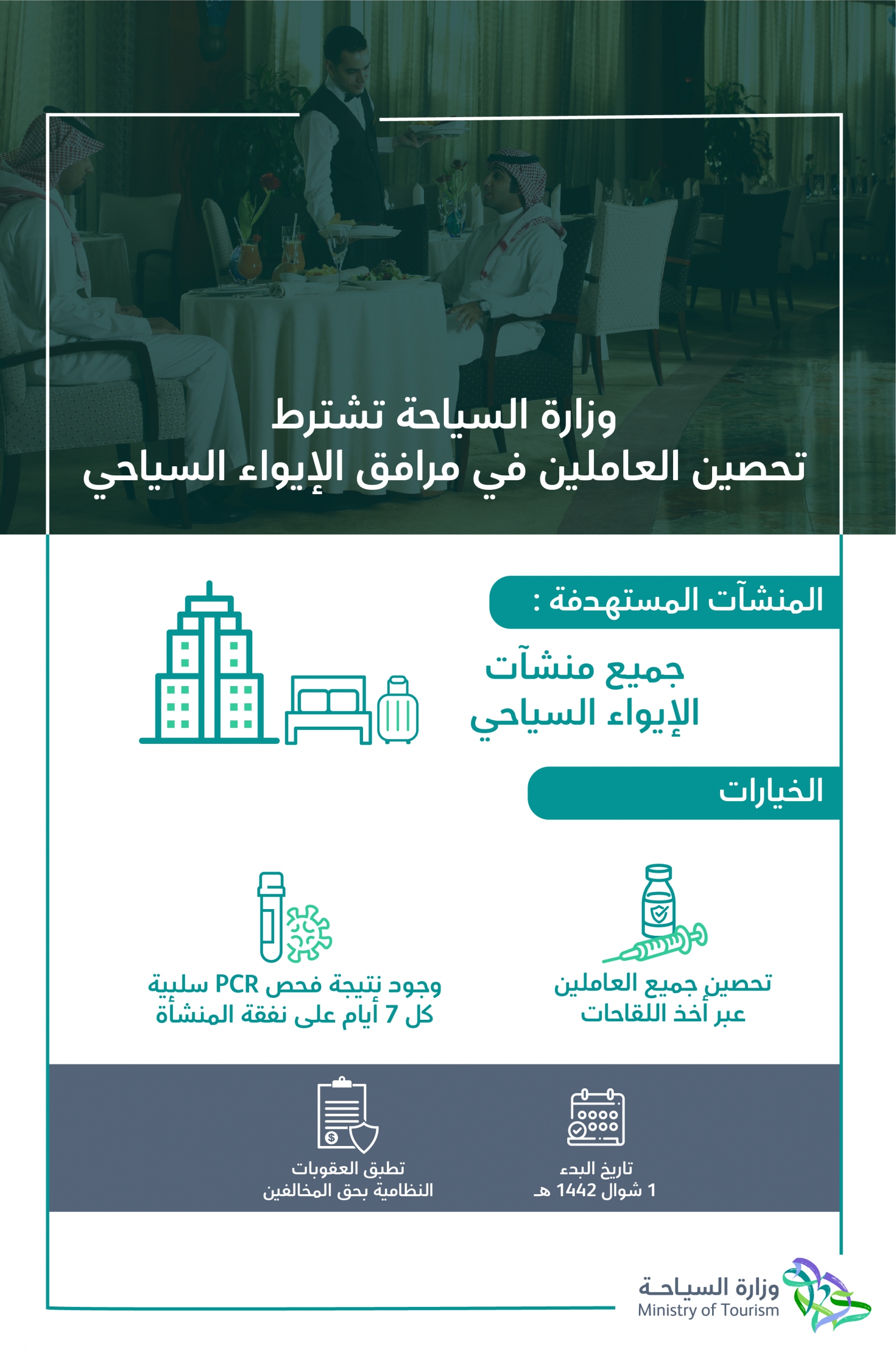 أكدت وزارة السياحة، أمس الأربعاء، أنها تشترط على جميع منشآت الإيواء السياحي تحصين العاملين بها ابتداء من 1 شوال المقبل، في ظل الإجراءات الاحترازية للوقاية من فيروس كورونا. المنشآت المستهدفة: وأوضحت الوزارة، على صفحتها الرسمية عبر تويتر، أن المنشآت المستهدفة هي جميع منشآت الإيواء السياحي، مشيرة إلى أن الخيارات المتاحة أمام المنشآت هي: "تحصين جميع العاملين عبر أخذ اللقاحات، ووجود نتيجة فحص pcr سلبية كل 7 أيام على نفقة المنشأة. وأضافت وزارة السياحة أنه سيتم تطبيق العقوبات النظامية بحق المخالفين بداية من 1 شوال 1442ه. الإجراءات الاحترازية والتدابير الوقائية: وكانت وزارة الداخلية جددت التأكيد على العقوبات المقررة حال عدم التزام منشآت القطاع الخاص بتطبيق الإجراءات الاحترازية والتدابير الوقائية لمنع تفشي فيروس كورونا (كوفيد- 19). وقالت الوزارة في بيان لها عبر تويتر: إن عدم التزام منشآت القطاع الخاص بالإجراءات الاحترازية والتدابير الوقائية يشمل ما يلي: * السماح بدخول غير الملتزمين بلبس الكمامة الطبية أو القماشية أو ما يغطي الأنف والفم. * عدم تأمين المطهرات والمعقمات في الأماكن المخصصة لجهاز قياس درجات الحرارة للموظفين والعملاء عند مداخل المولات والمراكز التجارية. * عدم تطهير العربات وسلال التسوق بعد كل استخدام. * عدم تطهير المرافق والأسطح وإغلاق أماكن ألعاب الأطفال وأماكن قياس الملابس ونحوها. عقوبات مخالفة الإجراءات الاحترازية: وقالت الداخلية: إنه في المرة الأولى تكون عقوبة المنشأة/ المسؤول الغرامة 10 آلاف ريال وتضاعف الغرامة في المرة الثانية، أما في المرة الثالثة فتتم مضاعفة العقوبة وإحالة المسؤول للنيابة العامة. وأوضحت وزارة الداخلية، أنه في حال كانت المنشأة تابعة للقطاع الخاص وتم تكرار المخالفة للمرة الأولى يتم إغلاقها لمدة ثلاثة أشهر، وفي حال تكررت للمرة الثانية سيتم إغلاق المنشأة ستة أشهر. ودعت الداخلية كل من يعلم عن أي تجمع مخالف إبلاغ الجهة المختصة عن مكان حدوثه، وذلك على الرقم المجاني 999 في جميع مناطق المملكة، باستثناء منطقتي مكةالمكرمةوالرياض، فيكون الإبلاغ على الرقم 911.