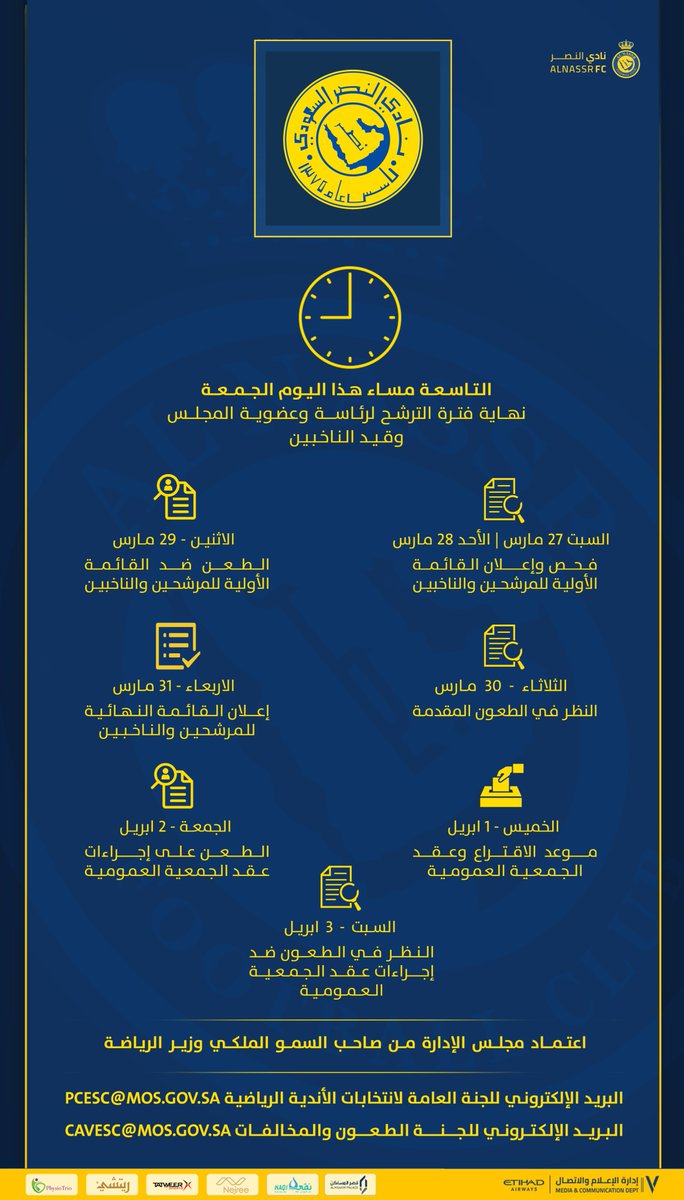 يترقب الجمهور النصراوي، المشهد حاليًّا داخل جدران أصفر العاصمة، لمعرفة آخر المستجدات وما ستُسفر عنه الانتخابات لاختيار مجلس إدارة جديد للنادي بعد حل مجلس إدارة صفوان السويكت بقرار من وزارة الرياضة. وكان الحساب الرسمي للعالمي أعلن قبل ساعة في "تويتر" عن نهاية فترة الترشح لرئاسة وعضوية المجلس وقيد الناخبين في تمام التاسعة من مساء اليوم الجمعة. خريطة عمل النادي بعد غلق فترة الترشح: وخلال يومي الغد وبعد غد، سيتم فحص وإعلان القائمة الأولية للمرشحين والناخبين، وفي يوم الاثنين المقبل سيتم الطعن ضد القائمة الأولية للمرشحين والناخبين. وفي يوم الثلاثاء المقبل، سيُنظر في الطعون المقدمة، ثم في يوم الأربعاء المقبل، سيتم الإعلان عن القائمة النهائية للمرشحين والناخبين. وفي يوم الخميس المقبل، سيكون موعد الاقتراع وعقد الجمعية العمومية، بينما في يوم الجمعة 2 إبريل سيتم الطعن على إجراءات عقد الجمعية العمومية، وفي يوم السبت المقبل، سيتم النظر في الطعون ضد إجراءات عقد الجمعية العمومية. وبعد ذلك، سيتم اعتماد مجلس الإدارة الجديد ل النصر من الأمير عبدالعزيز بن تركي الفيصل وزير الرياضة. سؤالان من جماهير النصر للإدارة الجديدة القادمة: وسيكون السؤال الأول من عشاق العالمي للإدارة الجديدة، هو كيفية تسديد الديون الموجودة على عاتق النادي، وكان آخرها مطالبة الفيفا بتسديد 20 مليون ريال لنادي فنربخشة التركي قيمة صفقة البرازيلي جوليانو، الذي لعب مع العالمي ثم فسخ عقده بسبب تأخر المستحقات المالية عليه، لينضم بعدها لنادي إسطنبول باشاك شهير التركي. والسؤال الثاني، سيكون حول خطة الإدارة الجديدة المقبلة على النصر، من أجل تحديد الصفقات المطلوبة للفريق، خاصة أنه من المتوقع وجود دعم كبير للغاية للإدارة المقبلة للعالمي بعد انضمام الأمير خالد بن فهد رمز العالمي للقائمة الذهبية بالنادي أمس الأربعاء.