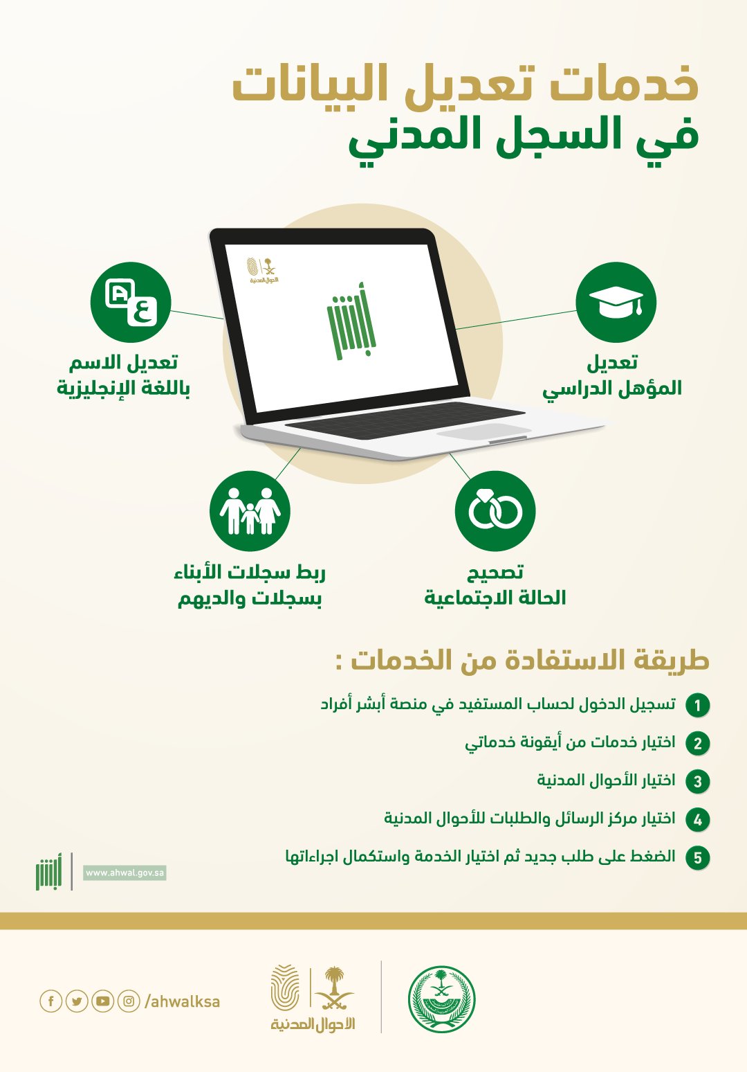 كشفت الأحوال المدنية عن طريقة الاستفادة من خدمات تعديل البيانات في السجل المدني ضمن الخدمات الإلكترونية عبر منصة أبشر. تعديل بيانات الأحوال المدنية: وأوضحت الصفحة الرسمية لوكالة وزارة الداخلية للأحوال المدنية عبر "تويتر" أن خدمات تعديل البيانات في السجل المدني هي: * تعديل المؤهل الدراسي. * تعديل الاسم باللغة الإنجليزية. * تصحيح الحالة الاجتماعية. * ربط سجلات الأبناء بسجلات والديهم. طريقة الاستفادة من الخدمات: وأشارت الأحوال المدنية إلى أن هناك 5 خطوات يمكن من خلالها الاستفادة من خدمات تعديل البيانات في السجل المدني: * تسجيل الدخول لحساب المستفيد من منصة أبشر أفراد. * اختيار خدمات من أيقونة خدماتي. * اختيار الأحوال المدنية. * اختيار مركز الرسائل والطالبات للأحوال المدنية. * الضغط على طلب جديد ثم اختيار الخدمة واستكمال إجراءاتها. إصدار بطاقة الهوية للزوجة: وكانت الأحوال المدنية أكدت أنه يمكن للزوجة والابنة إذا تجاوز عمرها 15 عامًا استخراج بطاقة الهوية الوطنية، ولا تشترط موافقة الزوج. وأوضحت أن إصدار الهوية الوطنية للذكور والإناث يكون اختياريًّا من سن 10- 15 عامًا، وإجباريًّا عند إتمام 15 عامًا، مشيرة إلى أن ذلك يتم بحجز موعد إلكتروني لزيارة أحد مكاتب وفروع الأحوال المدنية لإصدار هوية وطنية، واتباع المتطلبات الموجودة بتذكرة الموعد. وكشفت وكالة وزارة الداخلية للأحوال المدنية أنه إذا كان عمر المتقدم بين 10- 15 سنة، فيتم حجز موعد والتوجه إلى المكتب، ويلزم لإتمام ذلك حضور ولي الأمر.