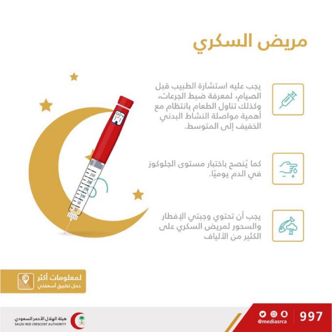 أوضح الهلال الأحمر السعودي، كيفية التعامل الذاتي مع مريض السكري خلال شهر رمضان المبارك والأمور التي يجب مراعاتها عند الصوم. طريقة التعامل الذاتي مع مريض السكري وأوصى الهلال الأحمر ، مريض السكري باتباع الخطوات التالية: * يجب عليك استشارة الطبيب قبل الصيام، لمعرفة ضبط الجرعات وكذلك تناول الطعام بانتظام مع أهمية مواصلة النشاط البدني الخفيف إلى المتوسط. * ينصح باختبار مستوى الجلوكوز في الدم يومياً. * يجب أن تحتوي وجبتا الإفطار والسحور لمريض السكري على الكثير من الألياف. نصائح لمرضى السكري في رمضان وينصح الأطباء النساء الحوامل والمرضعات اللواتي يحتجن للأنسولين بعدم الصيام، سواءً كن مصابات بمرض السكري من النوع الأول أو الثاني، كما أن غالبية المصابين بمرض السكري من النوع الثاني يكون باستطاعتهم الصيام دون الإصابة بمضاعفات، مع التشديد على ضرورة الالتزام ببعض التعديلات الغذائية والدوائية أثناء الصيام، ومراقبة معدل الجلوكوز في الدم بشكل مستمر. كما يجب تجنب الحلويات المحتوية على كميات عالية من السكر بعد الإفطار مع الإكثار من تناول الخضراوات الطازجة كالسلطة والخضروات المطبوخة. وينصح بشرب كميات كبيرة من الماء وليس العصائر بين الإفطار والسحور، فالجسم يحتاج من 6-8 أكواب كبيرة من الماء، ويجب أن يحتوي السحور على كمية كافية من البروتينات والدهون مع الإقلال من النشويات حتى يستمر معدل السكر في المستوى العادي لأطول وقت.