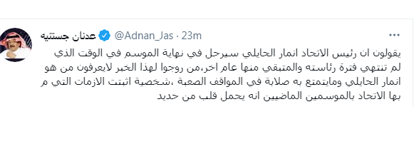 علق الناقد الرياضي والإعلامي عدنان جستنيه على ما تم تداوله بخصوص اقتراب أنمار الحائلي من مغادرة كرسي رئاسة نادي الاتحاد بنهاية الموسم الحالي. الحائلي يحمل قلبًا من حديد وغرد جستنيه قبل قليل قائلًا عبر حسابه في "تويتر" : "يقولون إن أنمار الحائلي سيرحل بنهاية الموسم في الوقت الذي لم تنته في رئاسته والمتبقي منها عام آخر، مَن روجوا لهذا الخبر لا يعرفون من هو أنمار وما يتمتع به من صلابة في المواقف الصعبة، شخصية أثبتت الأزمات التي مر بها النادي في الموسمين الماضيين، إنه يحمل قلبًا من حديد". الاتحاد يسير بشكل جيد يذكر أن نادي الاتحاد يحتل حاليًا المركز الثالث ب جدول ترتيب دوري الأمير محمد بن سلمان للمحترفين برصيد 46 نقطة، بعد تعادله مع الباطن بالجولة ال26 وبدون أهداف. كما يستعد الاتحاد لمواجهة نادي الرجاء البيضاوي المغربي في نهائي البطولة العربية خلال الفترة المقبلة. وكان الحائلي تولى رئاسة نادي الاتحاد في يونيو 2019، وذلك بعد فوزه بالانتخابات بالتزكية. ويستمر في كرسي رئاسة نادي الاتحاد حتى عام 2023، حيث تستمر الدورة الرئاسية لمجلسه لمدة 4 سنوات.
