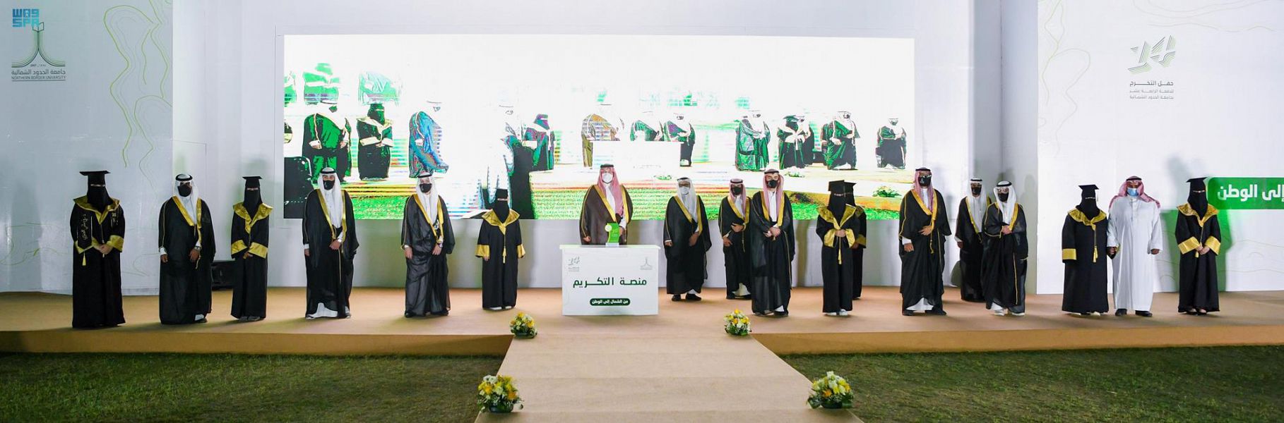 رعى صاحب السمو الملكي الأمير فيصل بن خالد بن سلطان بن عبد العزيز أمير منطقة الحدود الشمالية اليوم, حفل تخريج الدفعة 14 من طلاب وطالبات جامعة الحدود الشمالية البالغ عددهم (3386) خريجاً وخريجة في مختلف التخصصات والدرجات العلمية, وذلك بمدينة الأمير عبدالله بن عبدالعزيز بن مساعد الرياضية بمدينة عرعر. ثروة حقيقية: وقال الأمير فيصل بن خالد بن سلطان بن عبد العزيز في كلمته بهذه المناسبة: كوادرنا السعودية ثروتنا الحقيقة بالعلم تُصنَع وبقيمنا الأخلاقية تُدفع, لتُنافس وتنتج في المكتب والميدان والمعملِ والمصنع, لتضاهي بلادنا دول العالم أجمع, لافتاً سموه الانتباه إلى أن قيادتنا الحكيمة على العِلم بسخاء تُنفق, ولهذه المناسبات المُبهجة تتطلع, وبتخرجكم نحن وأهاليكم عيوننا من الأفراح تدمع, فهلموا للعمل بهمة عالية بقيم ومفاهيم أخلاقية نبيلة وسامية, وواصلوا التعلُم والتدريب؛ لمواجهة متغيرات السوق والظروف العاتية وكلنا ثقة بعقولكم وسواعدكم المبدعة البانية. شكر: وأضاف سموه: من لا يشكر الناس لا يشكر الله فالشكر والتقدير لوالديكم لما بذلوه ولمعالي رئيس الجامعة وأعضاء هيئة التدريس لعلمهم وجهدهم الذي أعطوه رغم الجائحة وما واجهوه ولوطننا المعطاء فبأعينكم ضعوه وبالمنافسات توجوه وبالمحافل الدولية قدموه. واختتم سموه كلمته قائلاً: كل التبريكات وصادق الأماني لمن تخرجوا اليوم وفي العام الماضي والود أننا احتفلنا بحضورهم جميعاً وقدمنا التهاني وعذرنا الجائحة وما يجب من تباعد اجتماعي. وبعد أن أخذ سموه مكانه عزف السلام الملكي، ثم بدأت مسيرة أوائل الخريجين والخريجات في كليات الجامعة المختلفة. حفل التخريج: وبدأ الحفل بتلاوة آيات من القرآن الكريم, ثم ألقيت كلمة الخرجين ألقاها نيابة عنهم الطالب علي العنزي والطالب سعود الشيلخي والطالبة نور الشمري, أعربوا من خلالها عن الشكر والتقدير لسمو أمير منطقة الحدود الشمالية على رعايته حفل تخرجهم ومشاركتهم فرحتهم وما يجده أبناء المنطقة من دعم وتحفيز دائم ومستمر, مثمنين الدور الكبير لأعضاء هيئة التدريس بالجامعة على ما اكتسبوه من مهارات وتسلّح بالعلم والمعرفة. بعد ذلك ألقى معالي رئيس جامعة الحدود الشمالية الدكتور محمد بن يحيى الشهري كلمه عبر فيها عن شكره وامتنانه لسموه على رعايته الحفل ومشاركة أبنائه الخريجين والخريجات فرحتهم في ظل الدعم اللا محدود من قبل القيادة الرشيدة ومتابعة من صاحب السمو الملكي أمير منطقة الحدود الشمالية. قسم المهنة: إثر ذلك أدى خريجو كلية الطب أداء قسم المهنة تلاه عميد الكلية الدكتور ماجد بن قريان الرويلي, ثم أعلن عميد عمادة القبول والتسجيل الدكتور مهند بن سالم المطيري أعداد الخريجين وأسماء المتفوقين والأوائل على الكليات وتكريمهم. وفي ختام الحفل تسلَّم سمو الأمير فيصل بن خالد بن سلطان بن عبدالعزيز هدية تذكارية بهذه المناسبة، والتقطت الصور التذكارية مع سموه.