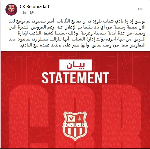 أكدت إدارة نادي شباب بلوزداد الجزائري في بيان رسمي، قبل قليل، عدم صحة توقيع نجم الفريق أمير سعيود لنادي الطائي، للانضمام إلى صفوفه بداية من الموسم الرياضي الجديد. بلوزداد ينفي توقيع أمير سعيود وأصدرت إدارة نادي شباب بلوزداد، بيانًا رسميًا، جاء فيه: "صانع الألعاب، أمير سعيود، لم يوقع حتى الآن بصفة رسمية في أي نادٍ مثلما تم الإعلان عنه، رغم العروض الكثيرة التي وصلته من عدة أندية خليجية وعربية، وذلك حسبما كشفه اللاعب لإدارة الفريق". وتابع البيان الذي تم إصداره على صفحة نادي بلوزداد الرسمية على موقع التواصل الاجتماعي "فيسبوك": "تؤكد إدارة الشباب، أنها ما زالت تنتظر رد، سعيود، بعد التفاوض معه في وقت سابق، وأنها تصر على تجديد عقده مع النادي". الطائي يعلن ضم سعيود رسميًا وكان نادي الطائي قد أعلن عبر حسابه الرسمي على موقع التدوينات القصيرة "تويتر"، مساء أمس الثلاثاء، عن تعاقده مع الجزائري أمير سعيود صاحب ال30 عامًا، لتمثيل صفوف الفريق الأول لكرة القدم لمدة موسمين. الطائي يعلن صفقة سعيود ويملك سعيود قدرات هجومية مميزة، وخبرات كبيرة لاحترافه في صفوف العديد من الأندية، ومنها؛ الأهلي المصري، الإسماعيلي، العربي الكويتي، الصفاقسي التونسي، ستارا زاغورا البلغاري، والثلاثي الجزائري المولودية، اتحاد العاصمة وشباب بلوزداد. وخطف أمير سعيود الأنظار خلال مشاركته مع الفريق الأول لكرة القدم بنادي شباب بلوزداد الجزائري في النسخة الأخيرة من بطولة دوري أبطال إفريقيا، وكان هدافه برصيد 8 أهداف. سعيود مقالات ذات صلة الشباب يُعير محمد عطية إلى الطائي الطائي يبدأ الاستعداد في بريدة الصرامي: الطائي والتعاون يرغبون في جلب حكام أجانب قرار يُلزم الطائي بدفع أكثر من نصف مليون ريال ل العروبة الطائي يضم دينر جوميز حتى 2023 التجديد 3 مواسم شرط الشباب لرحيل لاعبه الطائي يضم ناوليدج موسونا رسميًّا الطائي يُطمئن الجماهير على محمد عواجي رئيس الطائي بعد إنصاف النادي قانونيًّا : لا نلجأ للطرق الملتوية ونسامح الجميع