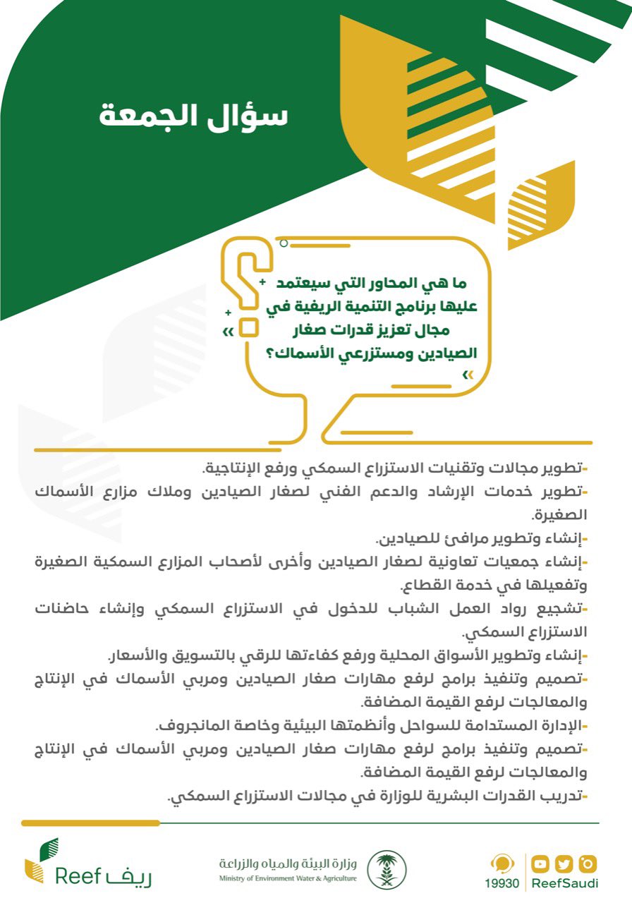 أوضح برنامج ريف كيف يخدم قطاع الثروة السمكية في المملكة؟ محاور دعم القطاع: وقال البرنامج عبر حسابه الرسمي بموقع تويتر، اليوم الجمعة: إن المحاور التي يعتمد عليها في مجال تعزيز قدرات صغار الصيادين ومستزرعي الأسماك تدور حول تطوير مجالات وتقنيات الاستزراع السمكي ورفع الإنتاجية، وكذلك تطوير خدمات الإرشاد والدعم الفني لصغار الصيادين وملاك مزارع الأسماك الصغيرة. إنشاء وتطوير المرافئ: وأيضًا، إنشاء وتطوير مرافئ للصيادين، وإنشاء جمعيات تعاونية لصغار الصيادين وأخرى لأصحاب المزارع السمكية الصغيرة وتفعيلها في خدمة القطاع، مع تشجيع رواد العمل الشباب للدخول في الاستزراع وإنشاء حاضنات. ما هو برنامج ريف ؟ برنامج ريف هو برنامج حكومي مخصص لدعم المزارعين وأسرهم الريفية المنتجة حيث يتم بموجب نتائج الأهلية دعم مستفيدي الأسر المنتجة شهريًا بنسبة 10% من رأس المال المسجل في بيانات الطلب، بحيث لا يتجاوز إجمالي الدعم للمستفيد قيمة رأس المال للمشروع، وبحد أقصى 54,000 ريال في السنة. أهداف البرنامج: وفي وقت سابق أوضحت وزارة البيئة والمياه والزراعة في المملكة العربية السعودية، أن برنامج ريف يهدف إلى تحسين القطاع الزراعي الريفي، ورفع مستوى معيشة صغار المزارعين، وزيادة الكفاءة والإنتاجية، وتحسين نمط الحياة، حيث تستقبل البوابة طلبات المستفيدين من القطاعات المختلفة التي يستهدفها البرنامج، من مختصي تربية النحل، ومنتجي البن العربي، والورد، والمحاصيل البعلية والفاكهة المستهدفة بالدعم، ليتم بعد ذلك تقديم الدعم المادي المباشر إلى جانب برامج تطويرية للمزارعين المسجلين بعد مراجعة طلباتهم. مقالات ذات صلة هل برنامج ريف يدعم العاطلين عن العمل؟ هل دعم برنامج ريف يشمل المتقاعدين؟ برنامج ريف : قبول السجل الزراعي بدلًا من صك ملكية الأرض برنامج ريف: البهارات والقهوة لا تعتبر من ضمن الأنشطة المدعومة برنامج ريف يوضح القطاعات المدعومة نسبياً في منطقة المدينةالمنورة هل يمكن للمزارع إعادة التسجيل في برنامج ريف مجددًا العام القادم؟ برنامج ريف يوضح مدة دراسة الأهلية لقطاع الأسر المنتجة توضيح من برنامج ريف حول إيقاف دراسة طلبات المتقدمين بمنطقة حائل برنامج ريف يحدد الأنشطة والمنتجات المدعومة