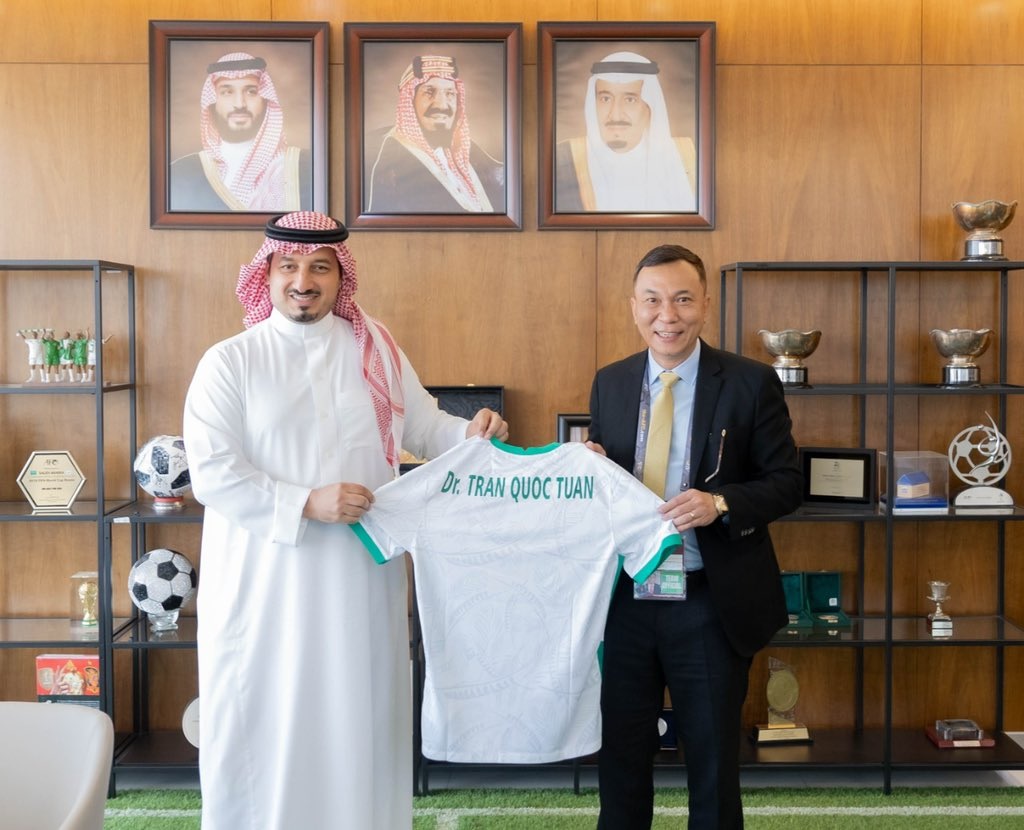 استقبل رئيس الاتحاد السعودي لكرة القدم ياسر المسحل، اليوم الخميس، نائب رئيس الاتحاد الفيتنامي، عضو المكتب التنفيذي الآسيوي رئيس لجنة المسابقات في الاتحاد الآسيوي الدكتور تران كووك توان. المسحل يجتمع مع نائب رئيس الاتحاد الفيتنامي وجرى خلال اللقاء الذي تم في مقر اتحاد الكرة في الرياض بحث سبل التعاون بين الاتحادين السعودي والفيتنامي وتعزيزها خلال الفترة المقبلة، وجهود الاتحاد السعودي في تعزيز علاقاته مع الاتحادات الأهلية في آسيا بما يخدم كرة القدم في القارة. ونشر حساب الاتحاد السعودي لكرة القدم الرسمي على موقع التدوينات القصيرة "تويتر"، صورًا من لقاء المسحل مع نائب رئيس الاتحاد الفيتنامي، كما حرص على إهدائه قميص الأخضر مكتوب عليه اسمه.