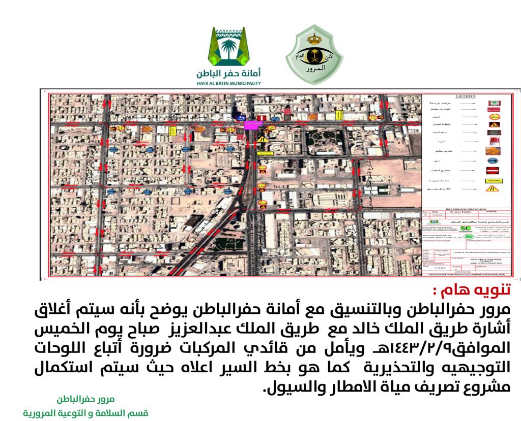 أصدرت إدارة المرور بحفر الباطن تنبيهًا لقائدي المركبات حول إغلاق إشارة طريق الملك خالد مع طريق الملك عبدالعزيز صباح اليوم الخميس لاستكمال مشروع تصريف مياه الأمطار والسيول. ودعا مرور حفر الباطن قائدي المركبات ضرورة اتباع اللوحات التوجيهية والتحذيرية كما هو موضح في خط السير. مشروع تصريف مياه الأمطار يذكر أن مشروع إنشاء قنوات تصريف مياه الأمطار بدأ العمل به قبل أكثر من عامين، وتجاوزت قيمته ال500 مليون ريال. ويتكون المشروع من شبكة من العبارات الصندوقية الخرسانية وأنابيب من الفايبرجلاس التي صممت خصيصًا للتصدي إلى كمية الأمطار الغزيرة التي تشهدها المدينة خلال مواسم الأمطار. مرور حفر الباطن